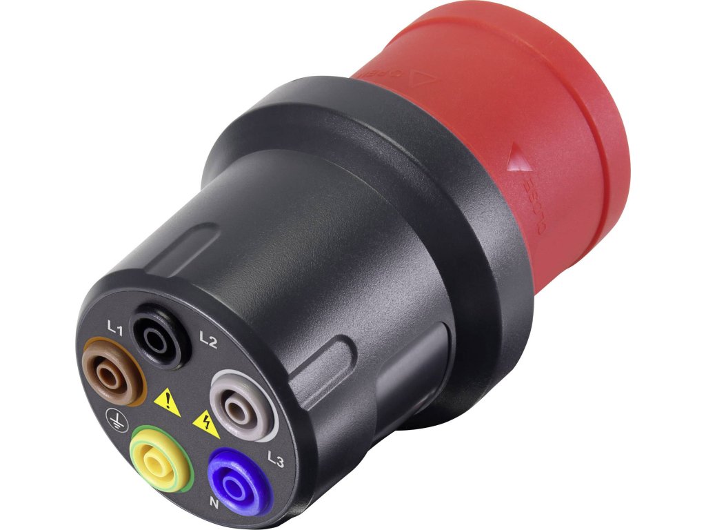 Bezpečné a proti dotyku chráněné zapojení do 32A CEE zásuvek · Připojení přes 5 oddělených 4mm zásuvek pro L1, L2, L3, N a PE · VDE 0100 měření v třífázové síti se standardními zkušebními přístroji · Odolné provedení · Vhodné pro 4mm měřicí kabely · Vhodné pro zásuvku CEE 32 A.