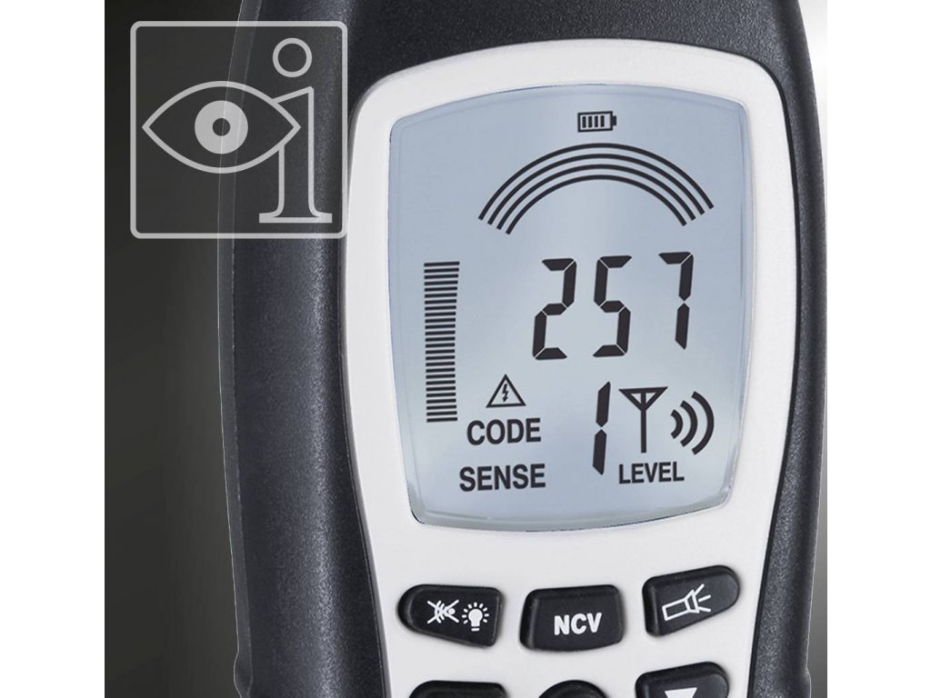 Bezkontaktní sledování přenosu signálu pomocí přijímače. Vyhledá instalační kabely, pojistky, jističe, kovové trubky (např. topenářské) a mnohé další. Vyhledává přerušení kabelů v izolaci. Detekuje kabeláž pod napětím i bez napětí. Vysoká frekvence 125 kHz. Zobrazení střídavého i stejnosměrného napětí. Kódování signálu umožňuje použití až 7 vysílačů najednou spolu s jedním přijímačem. Vestavěný detektor AC napětí. Stálá výstraha při AC napětí. Integrované osvětlení prostoru měření. Přehledný, podsvícený LCD displej.Obsah balení: