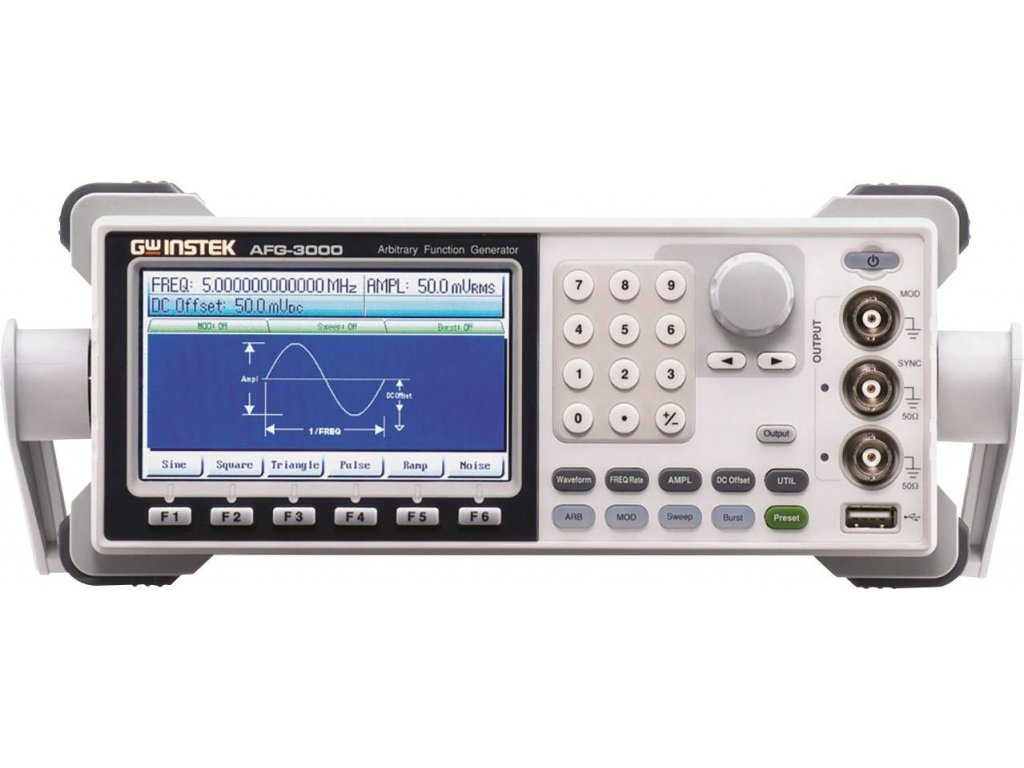 Generátor funkcí AFG-3032 s přímým digitálním generováním signálu (DDS) poskytuje šířku pásma 30 MHz a dva nezávislé kanály. Vybavení obsahuje standardní signály sinus, obdélník, rampa, puls, šum, DC, Sin(x)/x, exponenciální nárůst, exponenciální pokles, negativní rampu a libovolný průběh signálu 200 MSa/s. Navíc jsou k dispozici funkce modulace AM/FM/FSK, Sweep a Burst. Barevný LCD monitor s úhlopříčkou 10,9 cm zobrazuje všechny parametry, nastavení a průběh. USB rozhraní lze použít pro dálkové ovládání počítačem. Arbitrární průběh signálu lze vygenerovat pomocí volně dostupného PC® softwaru a přes USB přenést do generátoru. Ve spojení s pamětí osciloskopů řady GDS-3000 je možné regenerovat měřený digitální signál (DWR).Specifikace: