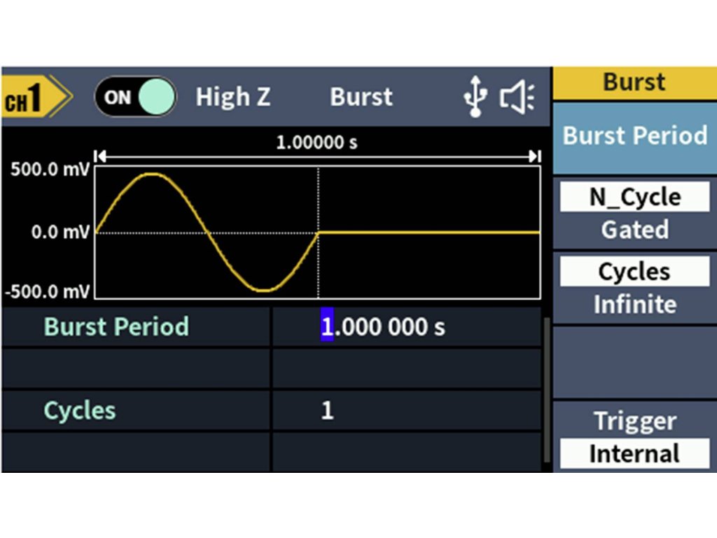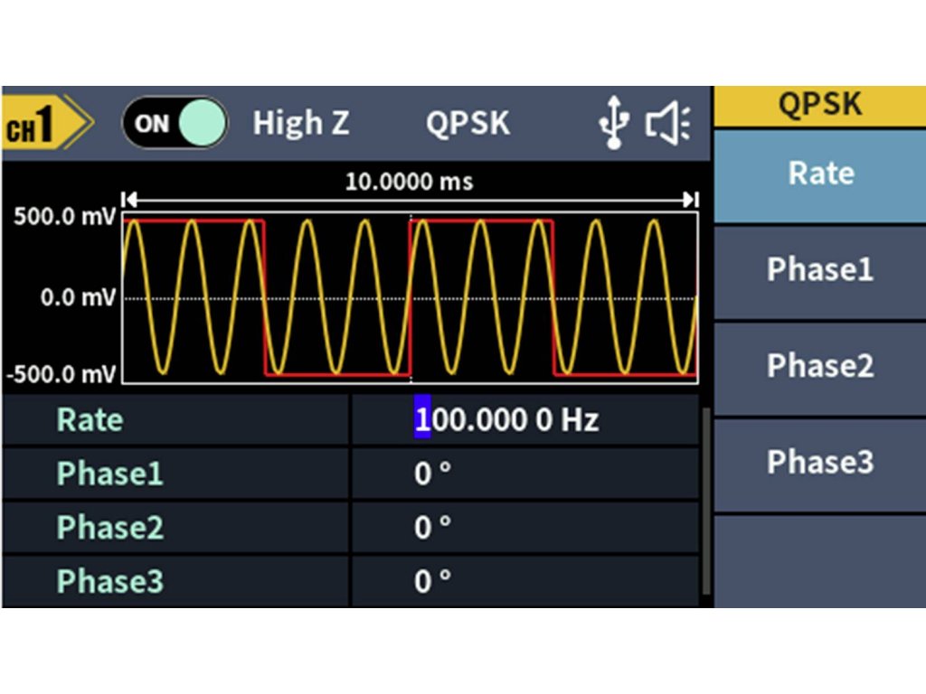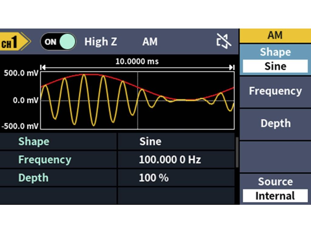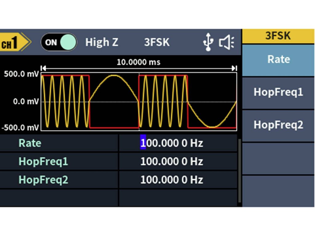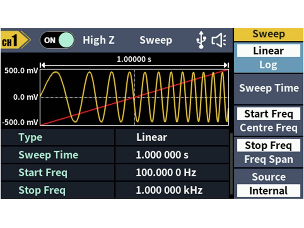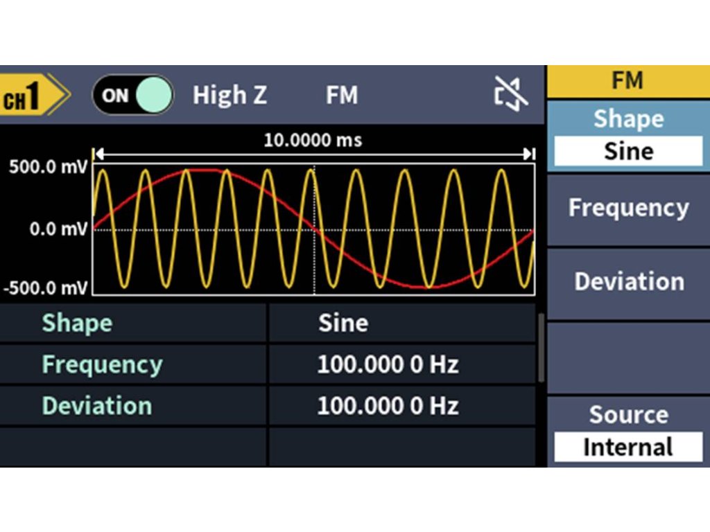 Rozsáhlý průběh signálu: Sinus, obdélník, impuls, rampa, šum a 150 integrovaných arbitrárních průběhůDélka hřídele: 2 PTS až 100 kMODULACE: AM, DSB-AM, FM, PM, ASK, FSK, PSK, BPSK, QPSK, 3FSK, 4FSK, OSK, PWM, SUM, SWEEP, BURSTFrekvenční rozsah: 100 MHz - 100 MHzRozlišení frekvenčního čítače: 7-místnýVstup: Vstup čítače frekvence, externí modulační vstup, externí trigger vstupVýstup: SyncKomunikační rozhraní: Rozhraní USB Host, USB zařízení