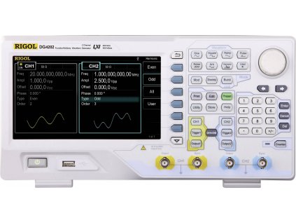 6 základních průběhů signálu: Sinus, obdélník, impuls, rampa, šum a harmonické vlny, 152 vestavěných arbitrárních signálních funkcí Mnoho možností modulace: AM, FM, PM, FSK, 3FSK, PSK, OSK, ASK, BPSK, PWM, Sweep, Burst · Frekvenční rozsah: 100 - 200 MHz · Rozlišení frekvenčního čítače: 7 míst · Délka signálu: 2 pts až 1 Mpts · Komunikační rozhraní: USB Host, USB zařízení, LAN · Vstup: Čítač, externí modulace, externí trigger, externí referenční takt