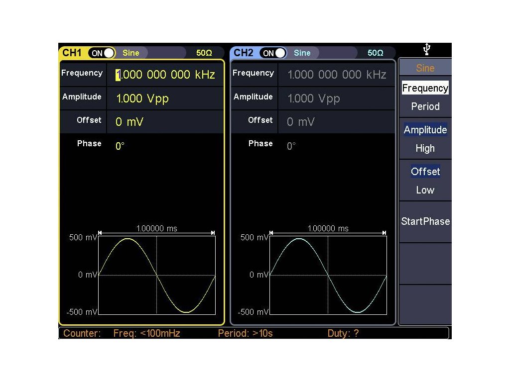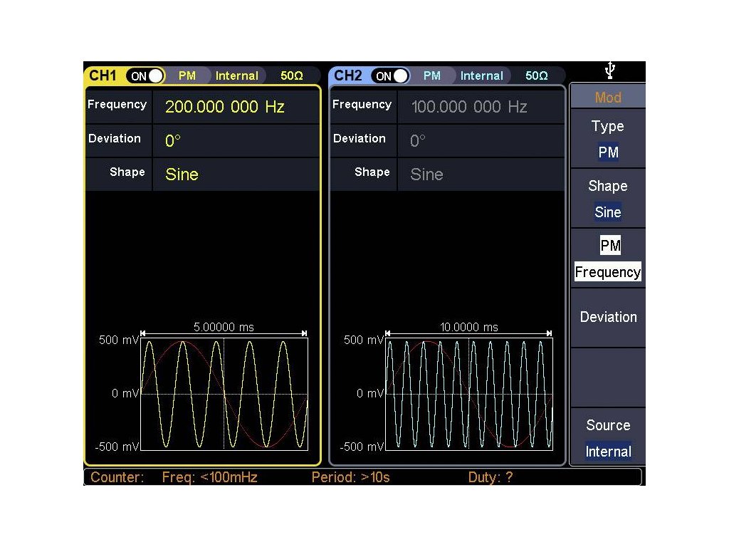 6 základních průběhů signálu: Sinus, obdélník, impuls, rampa, šum a harmonické vlny, 152 vestavěných arbitrárních signálních funkcí Mnoho možností modulace: AM, FM, PM, FSK, 3FSK, PSK, OSK, ASK, BPSK, PWM, Sweep, Burst · Frekvenční rozsah: 100 - 200 MHz · Rozlišení frekvenčního čítače: 7 míst · Délka signálu: 2 pts až 1 Mpts · Komunikační rozhraní: USB Host, USB zařízení, LAN · Vstup: Čítač, externí modulace, externí trigger, externí referenční takt