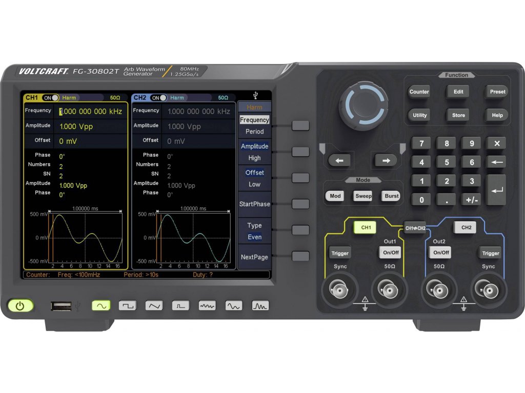 2kanálový arbitrární funkční generátor FG-30000T s dotykovým displejem. Tento arbitrární generátor funkcí produkuje díky svému digitálnímu generování signálu (technologie DDS) stabilní, přesné a čisté výstupní signály s šířkou pásma 80 MHz, vzorkováním v reálném času 1,25 GS/s (max.) a frekvenčním rozlišením 1 μHz. Generátor zvládá 6 základních signalizačních skupin (sinus, obdélník, rampa, šum a harmonické vlny) a 152 integrovaných arbitrárních signálů (1 μHz - 50 MHz) s vertikálním rozlišením 14 bitů Kromě toho nabízí mnoho možností modulace, mimo jiné AM, FM, FSK, 3FSK, PSK, OSK, ASK, BPSK, PWM, Sweep a Burst. Všechny parametry signálu a nastavení se zobrazují na 8" (20,32 cm) TFT LCD displeji s 800 x 600 pixely, ve snadno ovladatelném grafickém rozhraní.Tento text byl přeložen strojově.