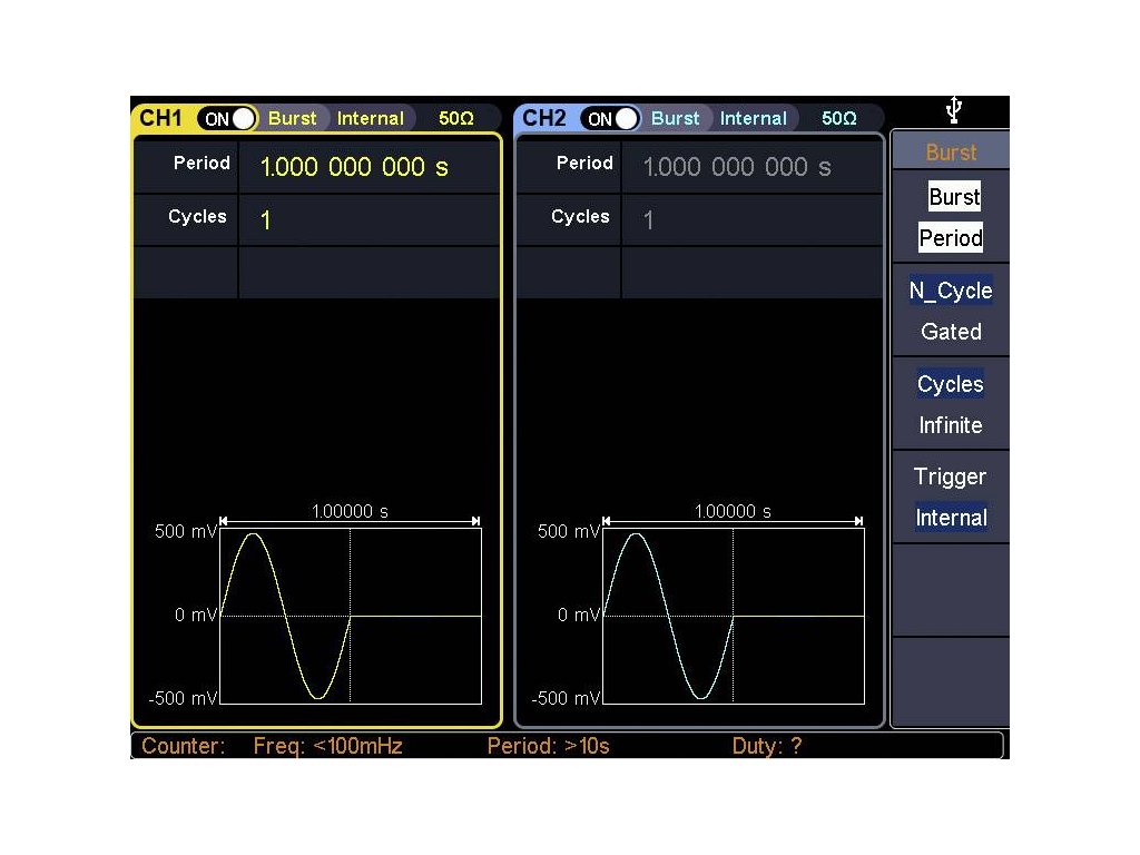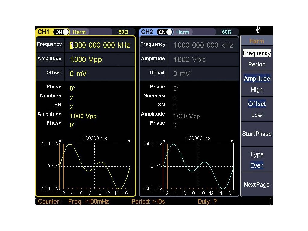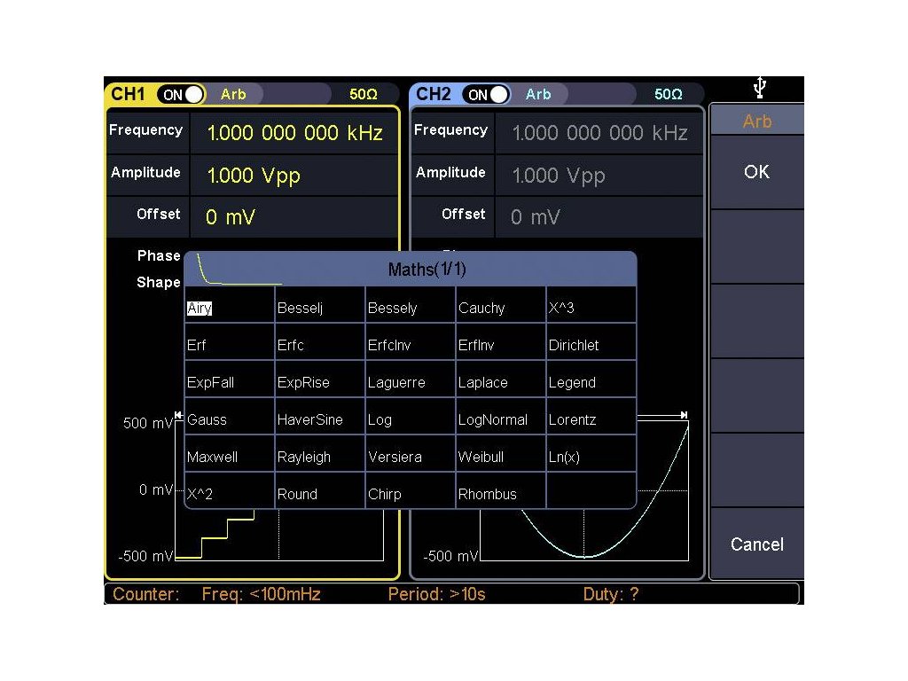Generátor zvládá 6 základní signál skupiny (sinus, obdélník, rampa, šum a harmonická) a 152 integrovaných arbitrárních signálů (1 μHz - 50 MHz) s vertikální rozlišení 14 bit. Kromě toho nabízí mnoho možností modulace, mimo jiné AM, FM, FSK, 3FSK, PSK, OSK, ASK, BPSK, PWM, Sweep a Burst.