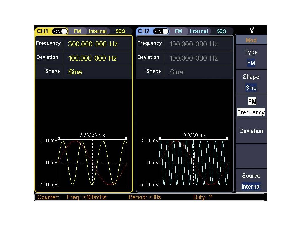 Četné možnosti: modulace AM, FM, PM, FSK, 3FSK, PSK, OSK, ASK, BPSK, PWM, Sweep, Burst · Frekvenční rozsah: 100 - 200 MHz · rozlišení frekvenčního čítače: 7 místy · Délka signálu: 2 pts až 1 Mpts · komunikační rozhraní: Rozhraní USB-Host, USB, LAN · Vstup: čítač, externí modulace, externí Trigger, externí referenční-takt
