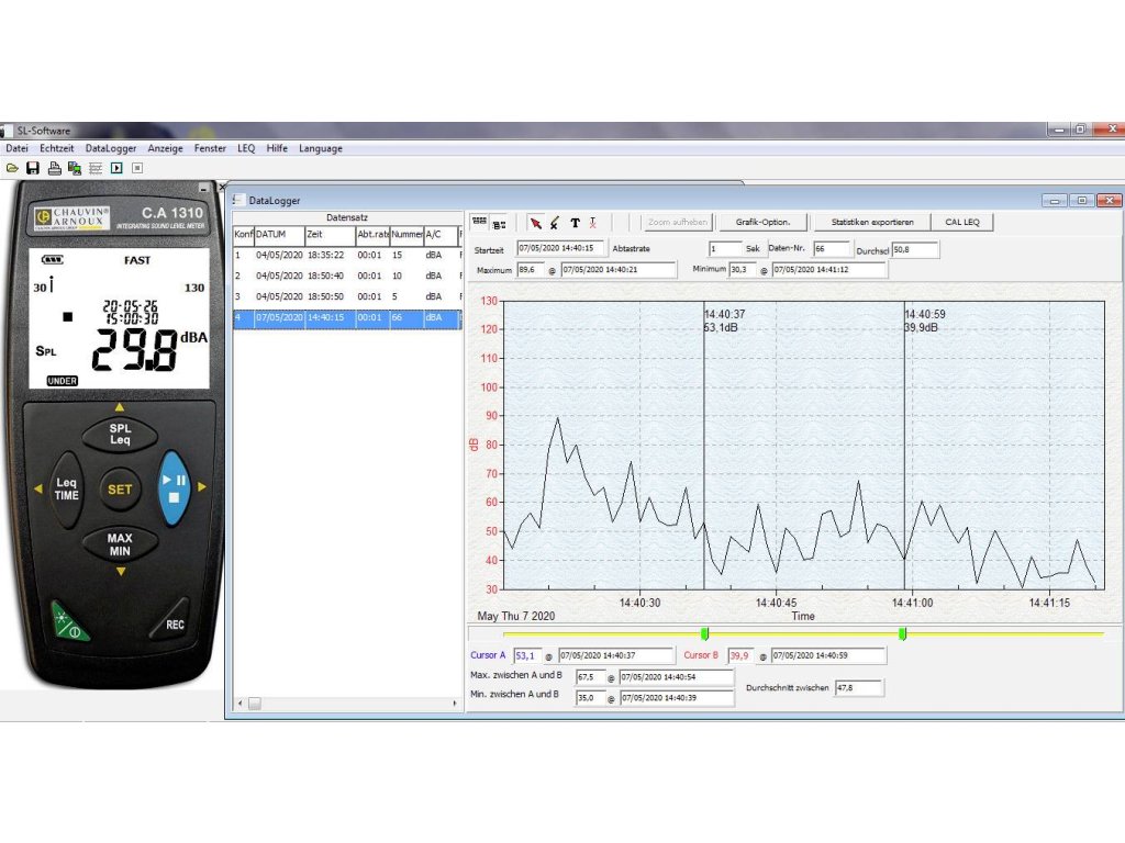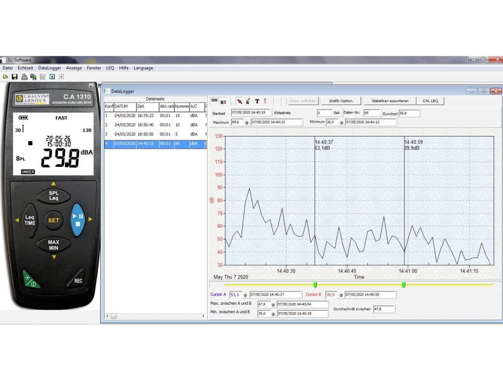 Pomocí dodávaného software SL lze naměřené údaje zobrazit v tabulce nebo grafickém znázornění. Kromě toho umožňuje export dat a režim reálného času.