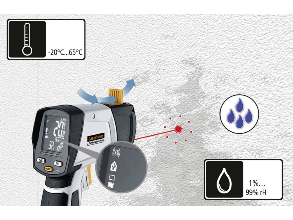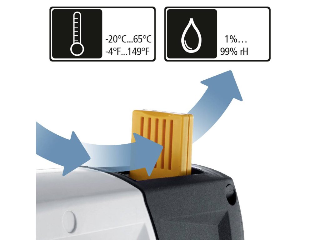 Tento infračervený teploměr je vhodný pro prevenci poškození budov kvůli lokalizaci tepelných mostů a kondenzační vlhkosti. Přístroj zjišťuje povrchovou teplotu, okolní teplotu, relativní vlhkost vzduchu a teplotu rosného bodu. Umožňuje také měření teploty na špatně přístupných místech nebo v ohrožených měřicích zónách. Na praktickém multifunkčním displeji se současně zobrazují různé naměřené hodnoty. Pouzdro je z velké části vyrobeno z recyklovaného materiálu a je cenným přínosem pro udržitelnost.Tento text byl přeložen strojově.
