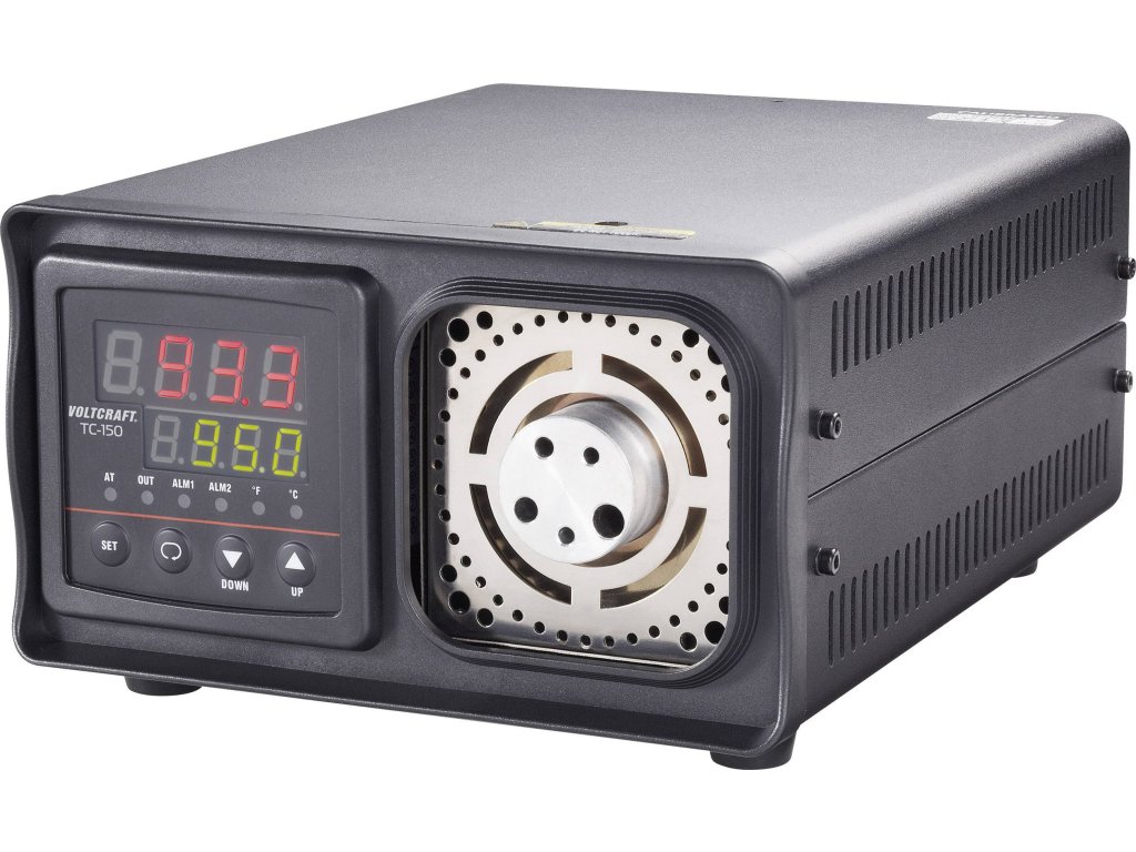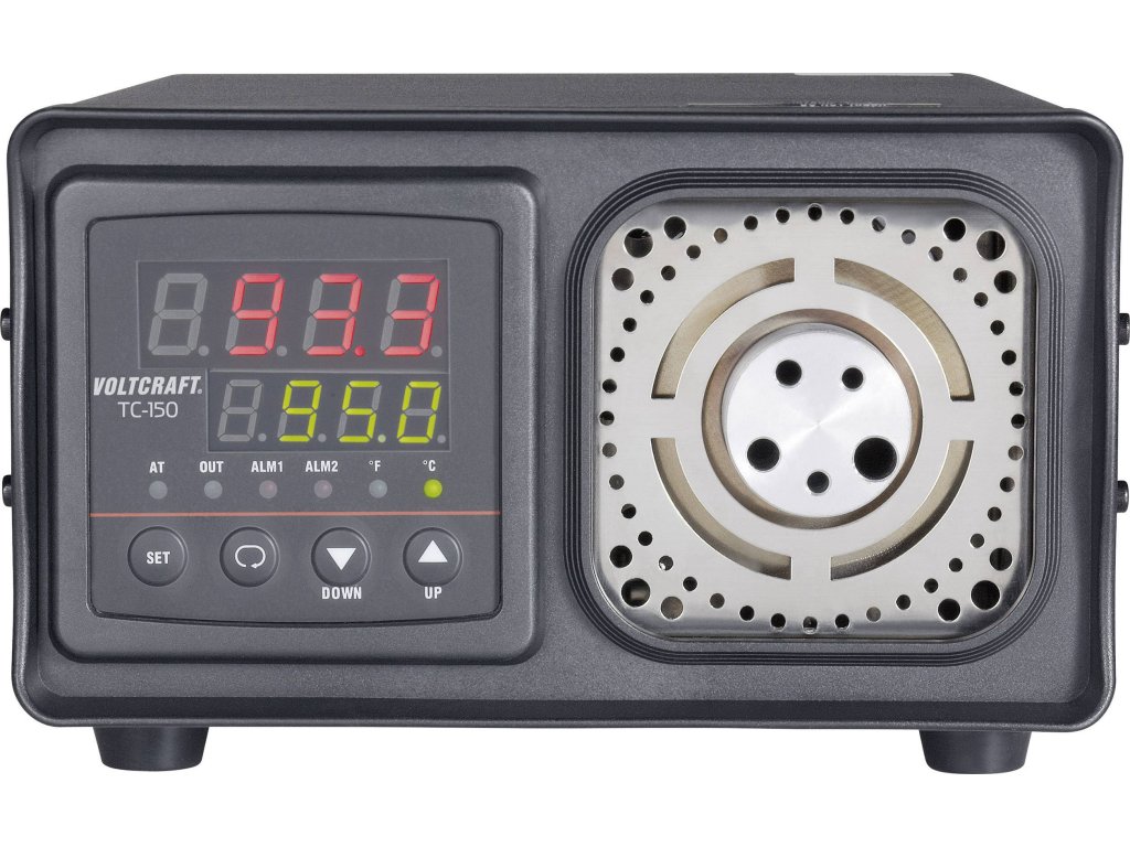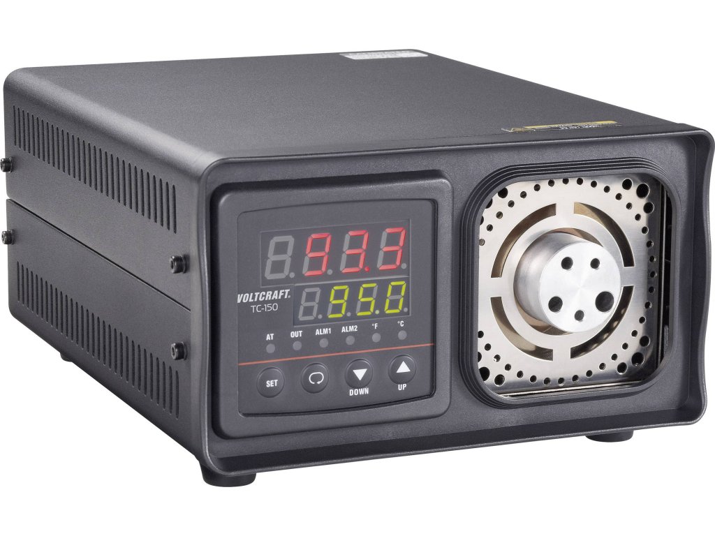 TC-150 umožňuje nastavení teploty kontaktních teploměrů. Teplota se nastavuje pomocí fóliové klávesnice. Dvouřádkový displej zobrazuje údaje o skutečné a požadované teplotě. Topné těleso obsahuje rozdílné otvory pro kontaktní měřící senzory s různým průměrem.Specifikace: