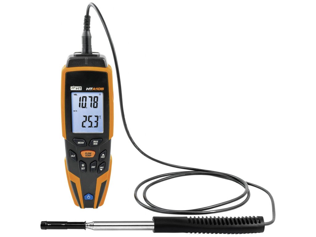 HTA105 byl vyvinut pro měření rychlosti vzduchu. K dispozici jsou evropské nebo anglosaské měřicí jednotky. Tento teploměr provádí měření s výsuvnou teleskopickou sondou, která díky vestavěným senzorům může provádět také měření teploty a vlhkosti. Mezi další funkce patří měření objemu průtoku vzduchu (CMM a CFM) a výpočet průměrných hodnot v objemu a čase. HTA105 je navíc vybaven interní pamětí, která umožňuje ukládat výsledky měření rychlosti vzduchu POMOCÍ funkcí MAX/MIN a Data HOLD. Je vybaven dvojitým displejem s podsvícením a automatickým vypínáním pro úsporu interní baterie.Tento text byl přeložen strojově.
