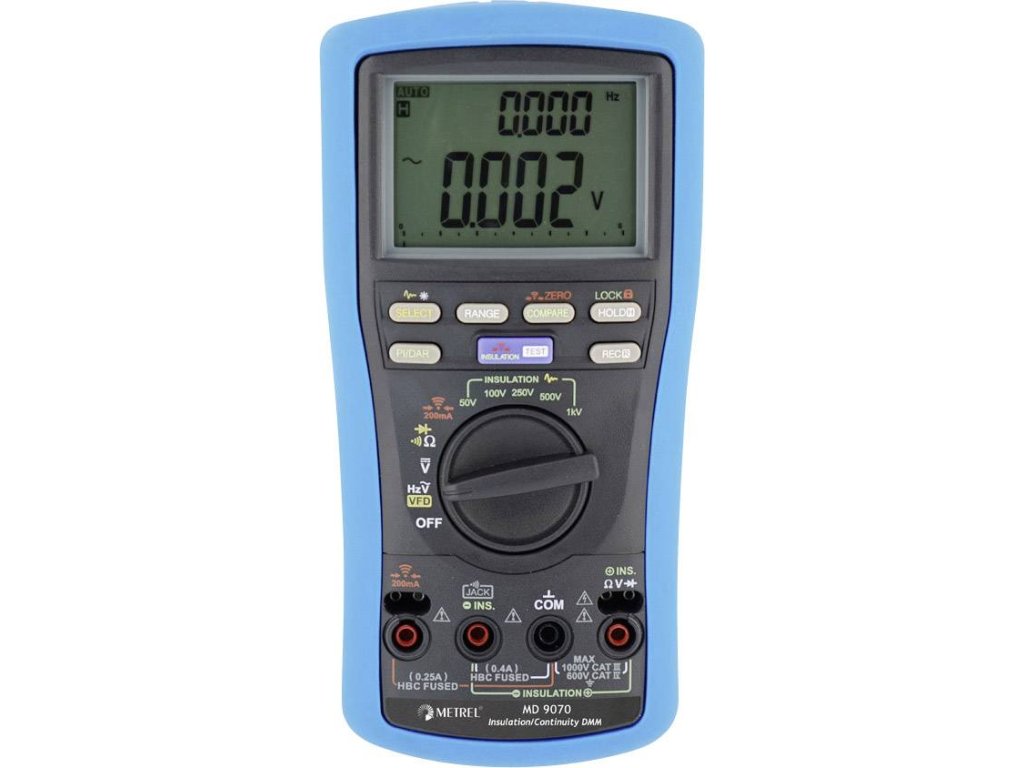 Přesný digitální multimetr MD 9070 je určen pro měření izolace a průchodnosti a lze jej používat v prostředí vyžadujícím bezpečnostní kategorii CAT IV 600 V. Na dvouřádkovém digitálním displeji se uživateli zobrazují všechna potřebná data. Velikost přístroje je zvolena tak, aby je bylo možné ovládat jednou rukou.Přístroj je vybaven vestavěnou funkcí VFD, která umožňuje měřit skutečné efektivní hodnoty v souladu s frekvencí a provádět test průchodnosti měřením PI / DAR a test diod. Model MD 9070 disponuje řadou dalších funkcí včetně funkce Data Hold, paměti, měření min./max. hodnot, výpočtu rozdílu, automatického vypnutí, automatické volby rozsahu měření, frekvenčního filtru, funkce blokování, funkce Reset, měření relativní hodnoty a mnoha dalších.