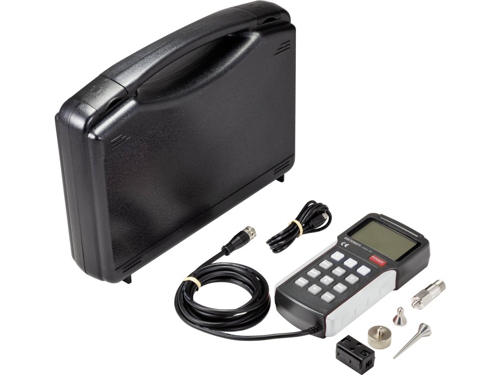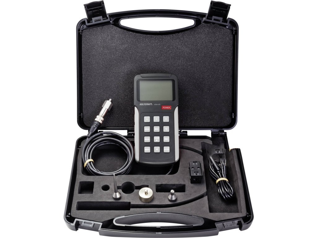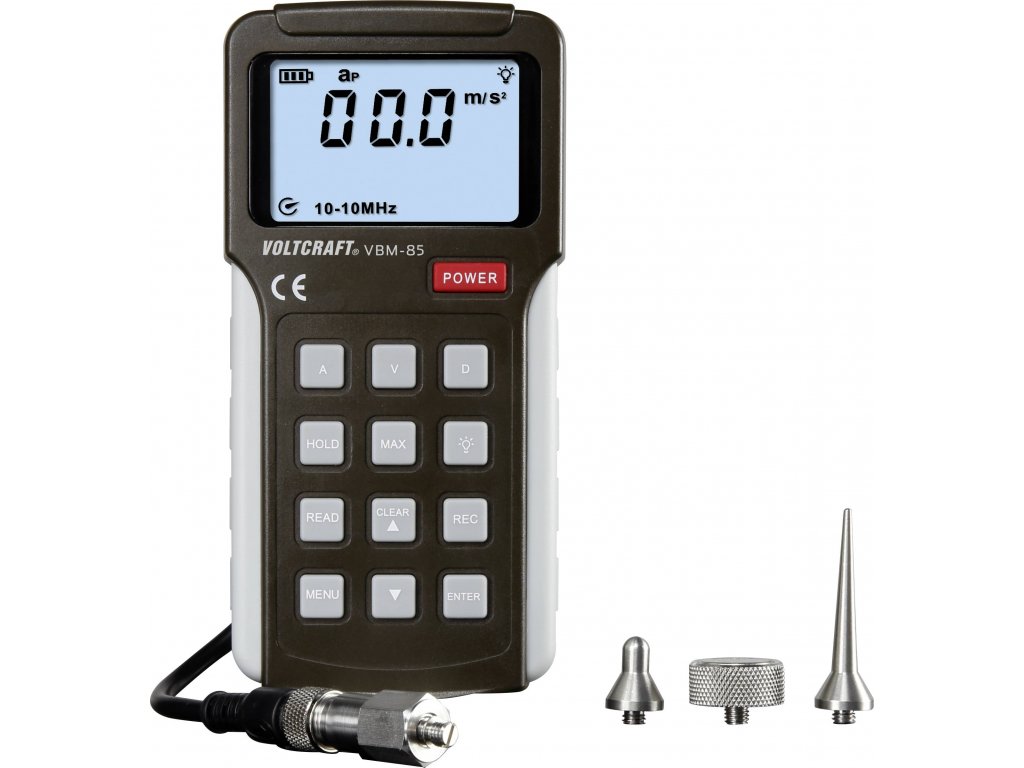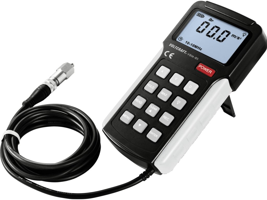 Mechanické měření strojů a zařízeníAkcelerometr Voltcraft VBM-85 se vyznačuje třemi druhy měření pro profesionální použití: Akcelerace, rychlosti a směru. Na velkém LCD displeji přístroje lze odečítat naměřené hodnoty a stav měření, kromě toho lze zvolit více frekvencí. Díky vysoce citlivé sondě lze provádět přesná měření na různých místech použití. Další praktická funkce: Po 10 minutách nečinnosti se měřicí přístroj sám vypne. Pro pohodlné vypnutí LCD podsvícení prostě stiskněte příslušné tlačítko. Součástí dodávky je mimo jiné magnetická patice, dlouhá a krátká sonda a transportní box.Specifikace: