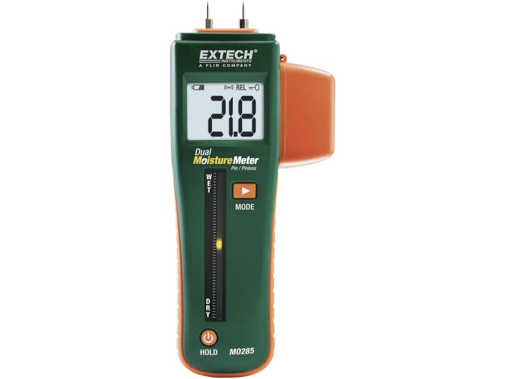 Tento měřič vlhkosti dřeva spojuje dvě metody měření v jednom. Pomocí zapichovacích trnů můžete měřit vlhkost dřeva přímo. V místech kde není možné zapichovací senzory použít, lze využit bezdotykového měření. Naměřené hodnoty se zobrazují na LCD displeji i na tří-barevném LED bargrafu.