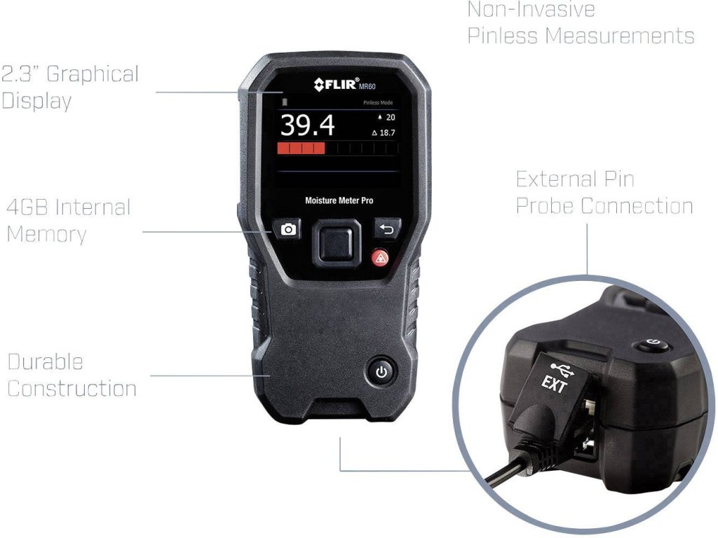 FLIR MR60 Pro je uživatelsky přívětivý měřič vlhkosti, který je kromě integrovaného bezkolíkového senzoru a externího kolíkového senzoru vybaven všemi pokročilými funkcemi, které potřebujete pro své potřeby profesionálního měření. Díky integrovanému bezkolíkovému senzoru a externímu kolíkovému senzoru se můžete v každé situaci rozhodnout, zda chcete použít invazivní či neinvazivní metodu měření. Vyberte si z 11 skupin materiálů pro měření vlhkosti pomocí externího kolíkového senzoru, nebo definujte referenční bod pro neinvazivní kontrolu vlhkosti. Uložte si vaše měření jako screenshoty a také do souboru CSV s příslušnými hodnotami jako jsou datum, čas a použité nastavení. Protože MR60 je navíckompatibilní se všemi externími čidly vlhkosti FLIR, můžete váš měřicí přístroj v případě potřeby kdykoli flexibilně rozšířit. Díky svému kompaktnímu a odolném designu, který vydrží pád ze 3 metrů, můžete MR60 jednoduše vzít všude s sebou - včetně míst, kde panují obzvláště tvrdé provozní podmínky.