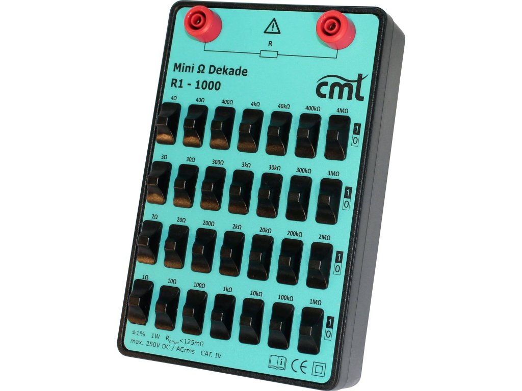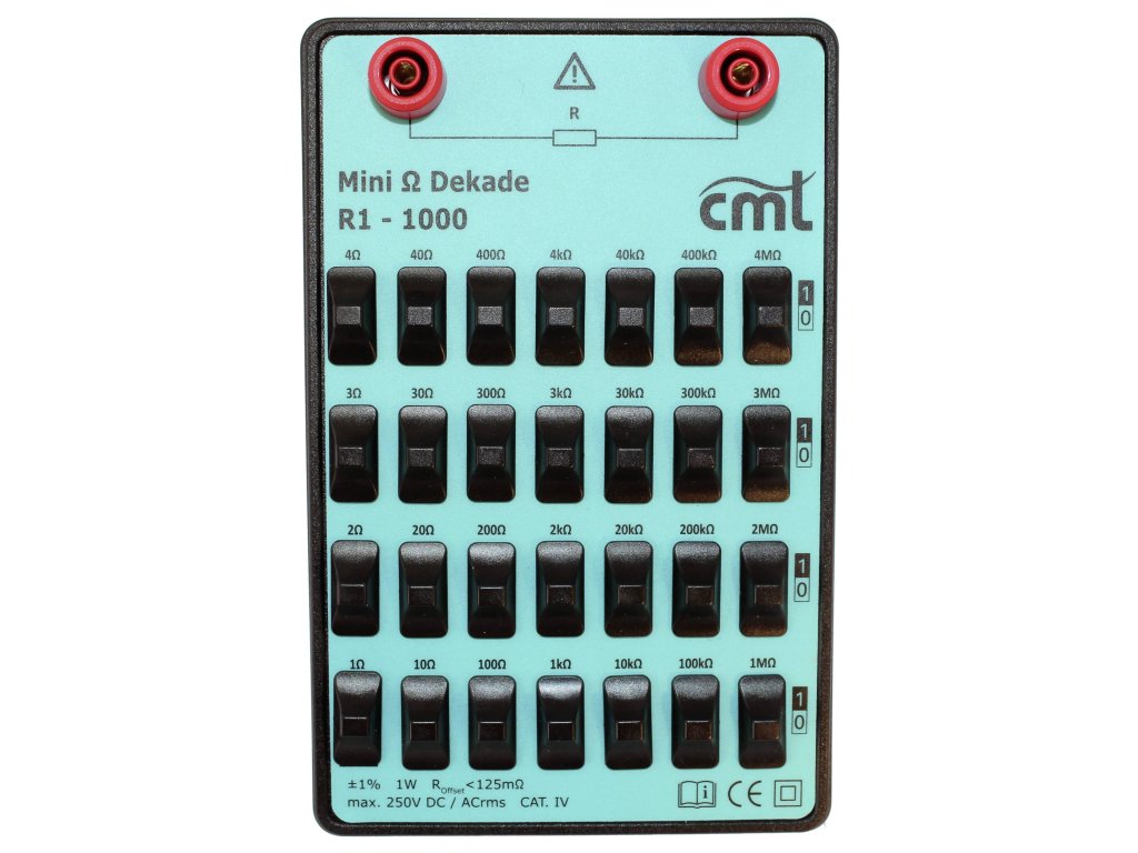 R1 - 1000 disponuje 28 sériově zapojenými 1W odpory, které lze jednotlivě aktivovat posuvným spínačem. Odstupňování hodnot odporu v 1 - 2 - 3 – 4 stupních dovoluje dokonalé nastavení hodnot odporu v 7 dekádách (1 Ω - 11,11111 MOhm). Nastavení např. 156 kOhm se provede navolením následujících spínačů: 100 kOhm, 40 kOhm + 10 kOhm, 4 kOhm + 2 kOhm. Připojení přes 4 mm bezpečnostní zdířky.Specifikace: