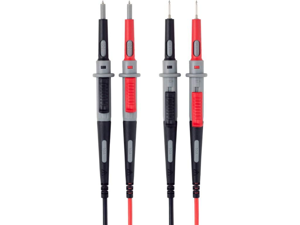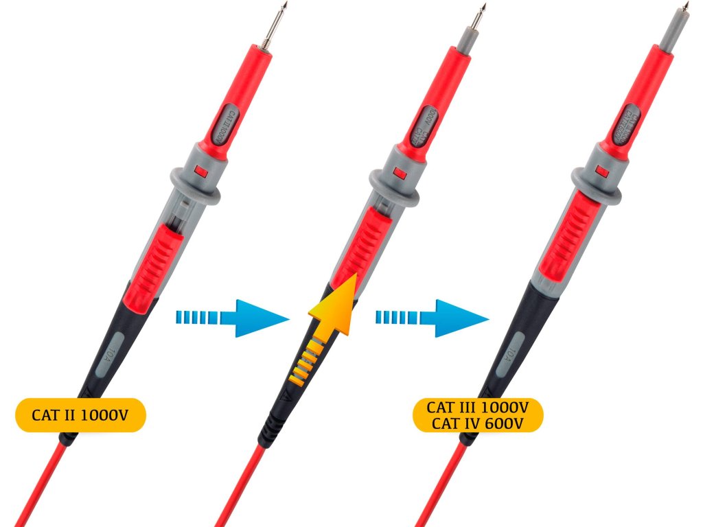 U tohoto modelu nemohou být ochranné krytky na měřicích hrotech ztraceny, protože je zde integrován posuvný mechanismus, který přebírá funkci ochranných krytek.Volně položený měřicí hrot je vhodný např. k měření kontaktu s již zapojenými svítidly. Stejně tak lze přímo připojit rozšíření jako krokosvorky s upevněním 2 mm.Kategorie měření při uvolňovaném 2 mm hrotu odpovídá Cat II.Pro měření kategorie Cat III 1000 v a Cat IV 600 v se ochrana jednoduše zasune dopředu a zajistí pomocí posuvného mechanismu.Vlastnosti: