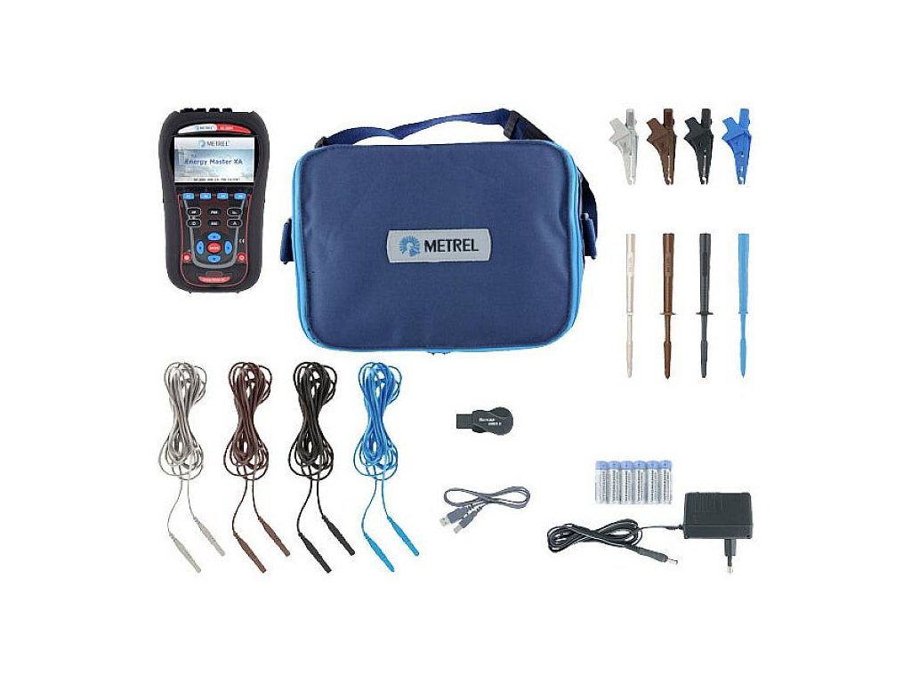 Zkušební přístroj Energy MasterZkušební hrot (hnědý, černý, šedý, modrý), 4 ksKrokosvorka (hnědá, černá, šedá, modrá), 4 ksMěřicí kabel napětí (hnědý, černý, šedý, modrý), 4 ksNálepka pro barevné označeníPaměťová karta microSD 8,0 GBČtečka microSD karetPC SW PowerView3USB kabelNapájecí adaptérAkumulátor NiMH 1.2 v, 6 kusůPolstrovaná brašna.Kalibrační protokol