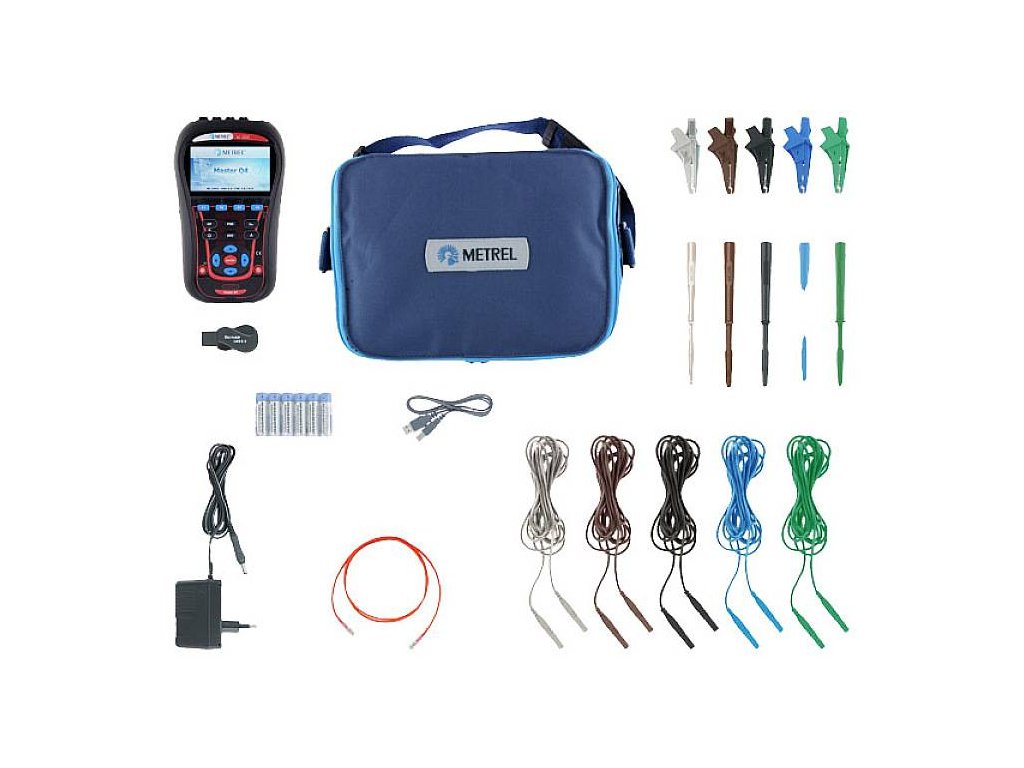 Přístroj Master Q4Zkušební hrot (hnědý, černý, šedý, zelený, modrý), 5 kusůKrokosvorka (hnědá, černá, šedá, zelená, modrá), 5 kusůMěřicí kabel napětí (hnědý, černý, šedý, zelený, modrý), 5 kusůTeplotní senzorPaměťová karta microSD 8,0 GBPC software PowerView3Patch kabel USB a EthernetSíťový adaptérAkumulátor NiMH 1,2 v, 6 kusůPolstrovaná brašna.Kalibrační protokol