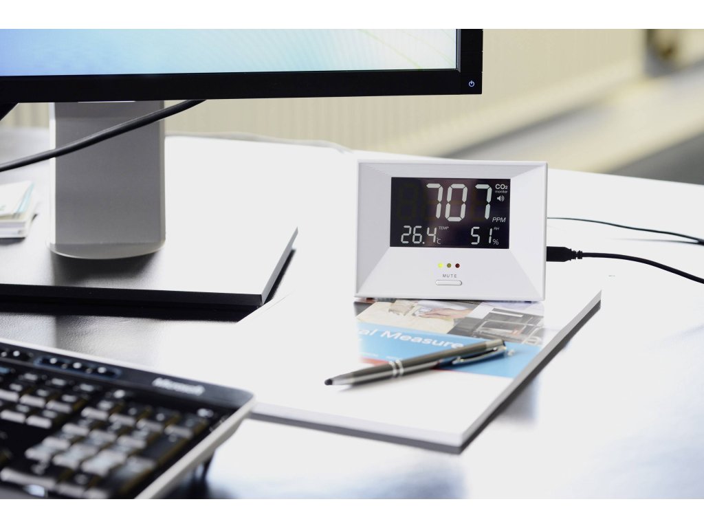 Nový monitor vnitřního klimatu RM 100 současně měří teplotu a vlhkost vzduchu i obsah CO2. Naměřené hodnoty jsou na velkém, podsvíceném displeji dobře čitelné. Obsah CO2 ve vzduchu je také indikován třemi LED diodami jako dobrý, střední nebo špatný. Při překročení mezní hodnoty CO2 spustí RM 100 zvukový alarm - pak je nejvyšší čas na chvíli vyvětrat.Specifikace: