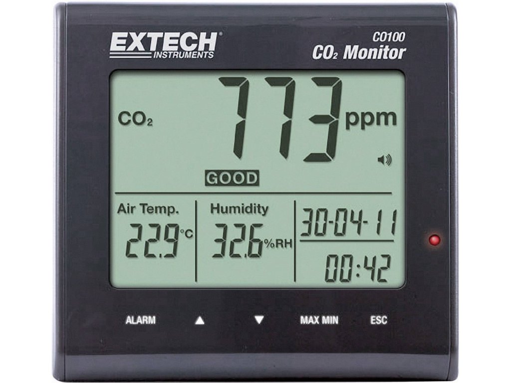 Přístroj CO100 pro kontrolu kvality vzduchu v místnostech, ve kterých může být problematická koncentrace CO2. Příliš vysoká hodnota má negativní vliv na zdraví, schopnost soustředit se a na psychickou pohodu. Hodnoty CO2 by měly být sledovány ve všech místnostech, kde se vyskytuje velké množství lidí po delší dobu. Naměřené hodnoty CO2, teploty vzduchu, vlhkosti vzduchu, stejně jako čas a datum mohou být zobrazeny současně. Pro jednoduché zhodnocení hodnoty CO2 se navíc zobrazí Index-Symbol: Good (0 - 800 ppm), Normal (800 - 1200 ppm), Poor (Specifikace: