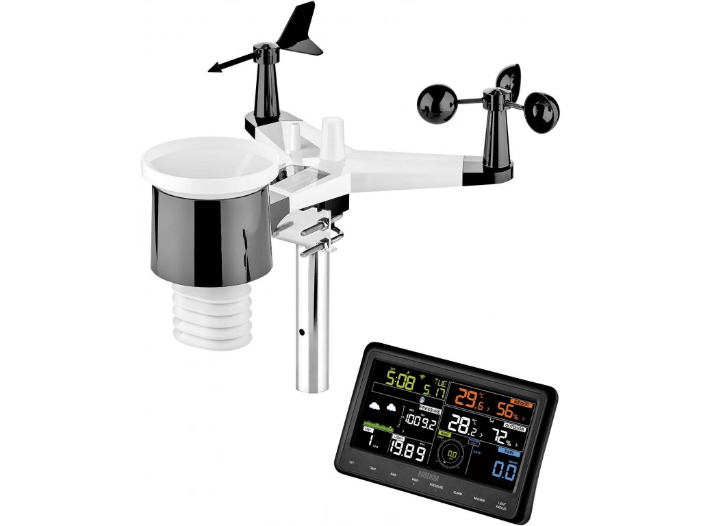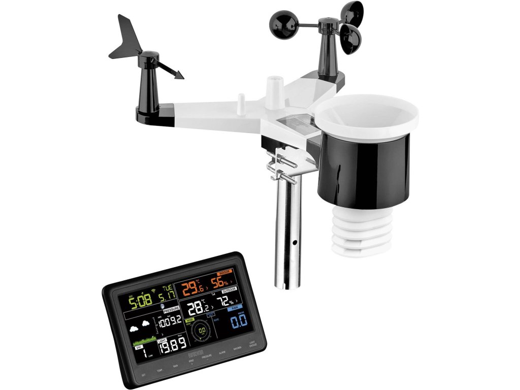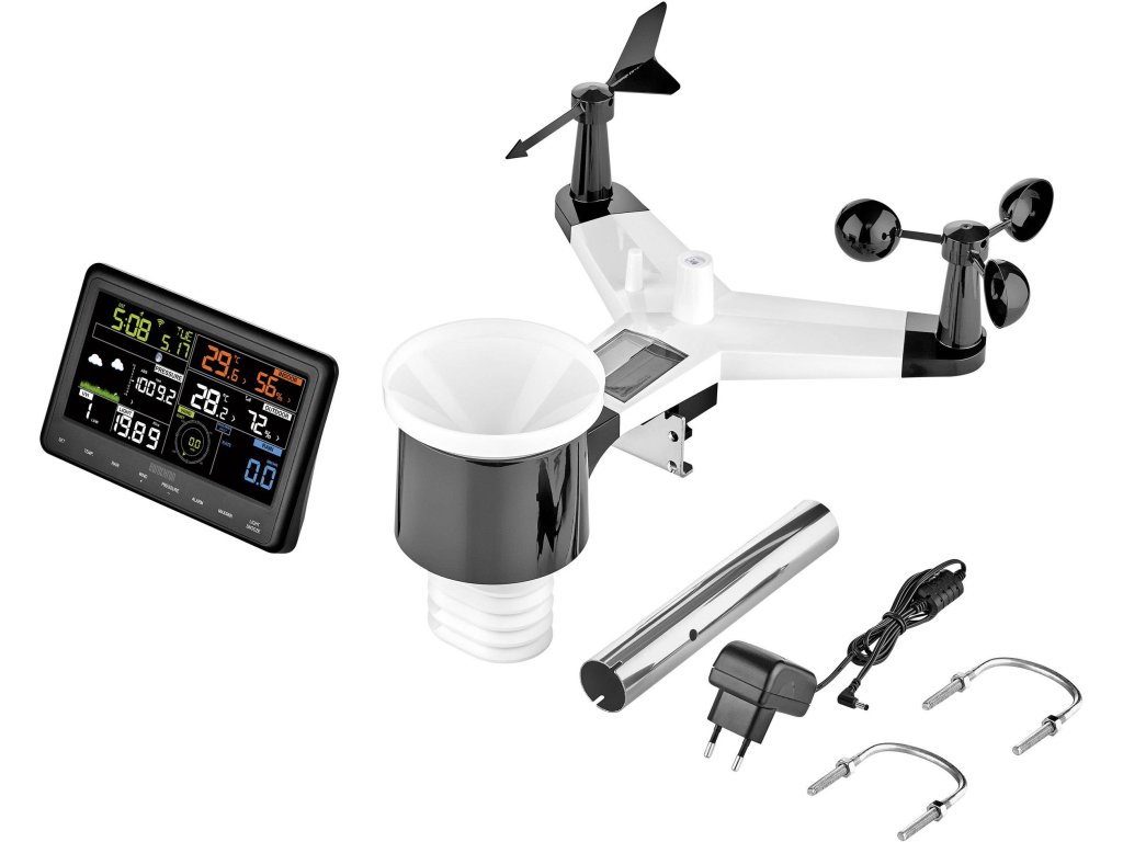 Barevná meteostanice·Venkovní senzor·Větrník·Senzor rychlosti větru·Dešťový trychtýř·Uchycení na sloup (max.5 cm) s montážním materiálem·Napájecí zdroj