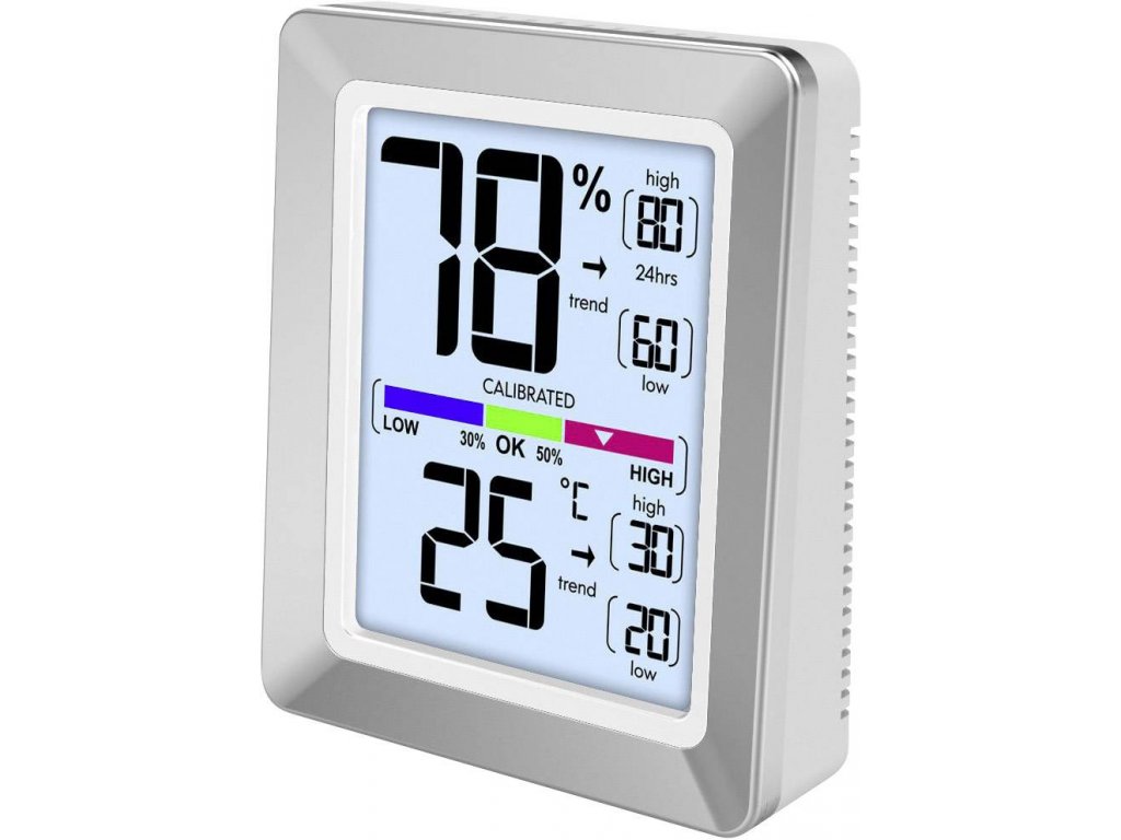 Dotykový senzor · Chromový povrch · Ukazatel ve °C/°F · Zobrazení vývoje teploty · Zobrazení vlhkosti vzduchu · Tendence vlhkosti vzduchu displej · Teplota a vlhkost vzduchu kalibrovatelné · Barevný ukazatel pohodlí v místnosti · MIN / MAX zobrazení teploty a - vlhkost vzduchu · Podsvícení díky Soft Touch · Indikace vybité baterie · Teploty a vlhkosti vzduchu pro zlepšení přesnost · Možnost kalibrace