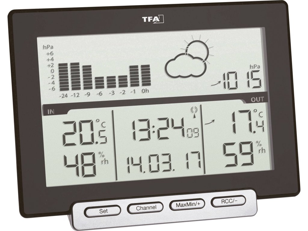 | Funkce (meteostanice): | venkovní teplota · hodiny řízené rádiovým signálem (např. DCF77) · předpověď počasí · vnitřní teplota · vnitřní vlhkost vzduchu · venkovní vlhkost vzduchu · tlak vzduchu · max./min. hodnota · max. 3 čidla · nastavitelné časové pásmo · stav baterie/akumulátoru · datum |