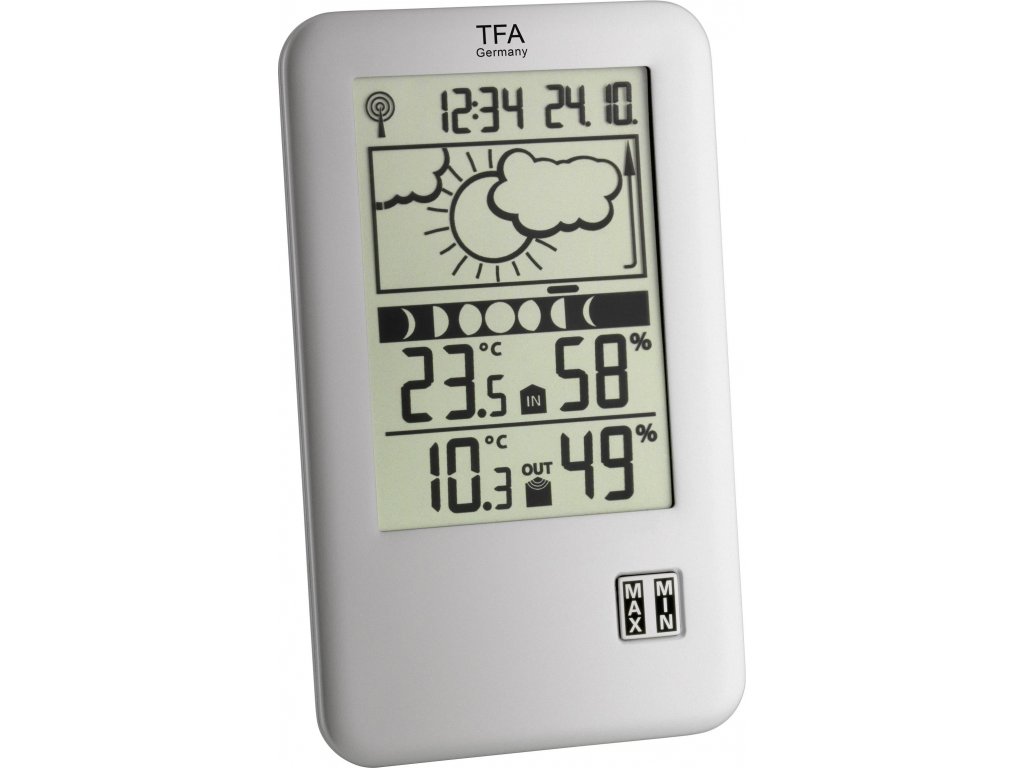 Hodiny řízené rádiem (DCF-77) s možností manuálního nastavení · Příjem časovéno signálu lze vypnout · Možnost nastavení časového pásma v rozsahu ±12 hodin · Kalendář · 8 fází Měsíce · Předpověď počasí s ukazatelem vývoje · Paměť pro minimální a maximální hodnoty · Indikace nízkého stavu baterie · Umístění na stůl nebo montáž na stěnu · Vnější senzor s indikací vnější teploty a vlhkosti vzduchu.