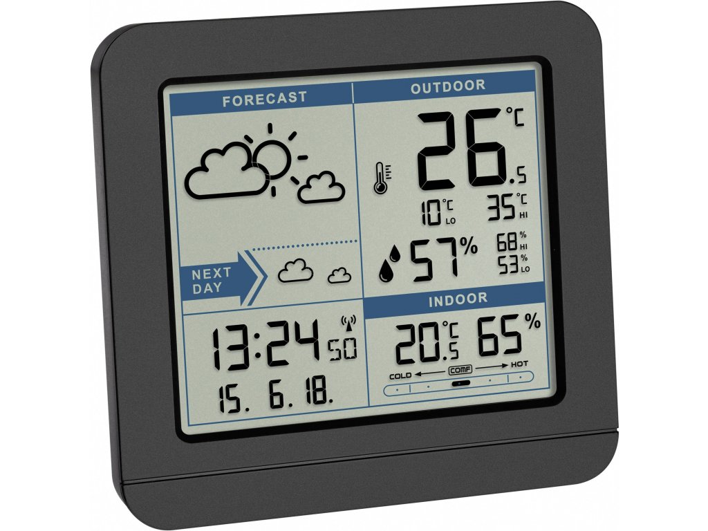 Funkce (meteostanice): | venkovní vlhkost vzduchu · venkovní teplota · datum · hodiny řízené rádiovým signálem (např. DCF77) · vnitřní vlhkost vzduchu · vnitřní teplota · max. 1 čidlo · předpověď počasí · den v týdnu · komfortní displej · max./min. hodnota · poplach při mrazu |