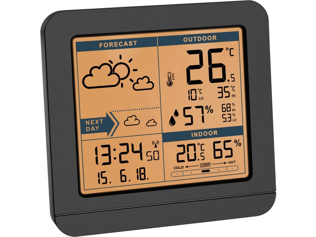 Co dělá počasí? Pohledem na rádiovou meteostanici SKY budete ihned obsáhle otestovány přehled o tom. Symbolů počasí ukazují aktuální povětrnostní situaci a předpověď na příští den. Venkovní teplotě a vlhkosti vzduchu jsou přenášeny vlastním rádiovým vysílačem. Nejvyšší a nejnižší hodnoty jsou napájeny trvale a denně automaticky zpět. Přídavný paměť s manuálním zajištěním umožňuje pozorování maximálních a minimálních hodnot přes i libovolnou dobu; dokonce i ve dne i datum záznamu jsou k dispozici.Interní senzory měří vnitřní teplotu a vlhkost vzduchu a zobrazí kvalitu vzduchu ve komfortní zóny.
