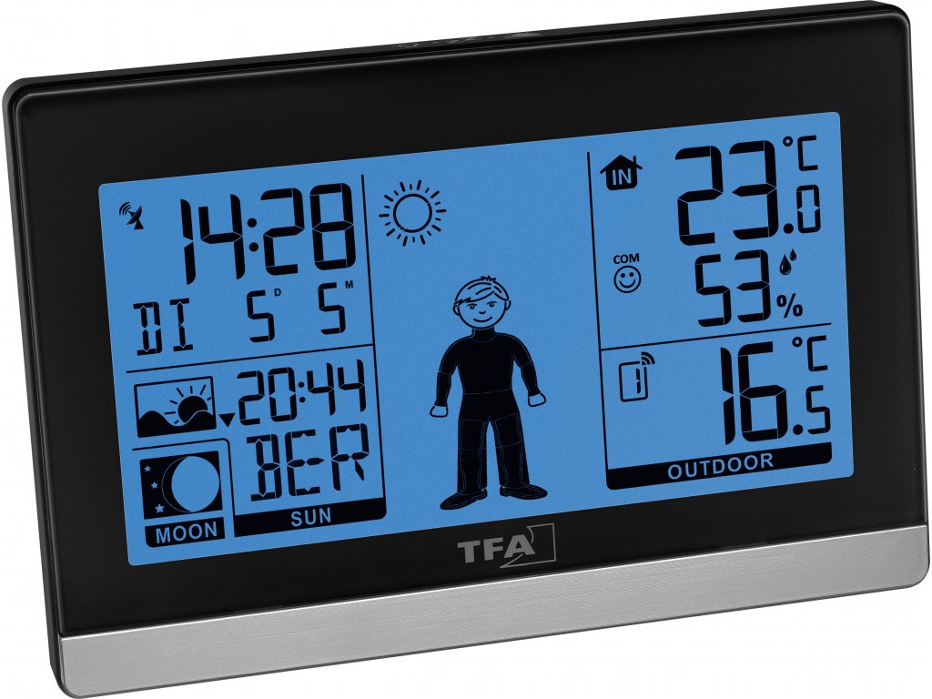 Funkce (meteostanice): | venkovní teplota · datum · hodiny řízené rádiovým signálem (např. DCF77) · vnitřní vlhkost vzduchu · vnitřní teplota · komfortní displej · max. 3 čidla · měsíční fáze · čas východu a západu slunce · tendenční ukazatel(e) · den v týdnu |