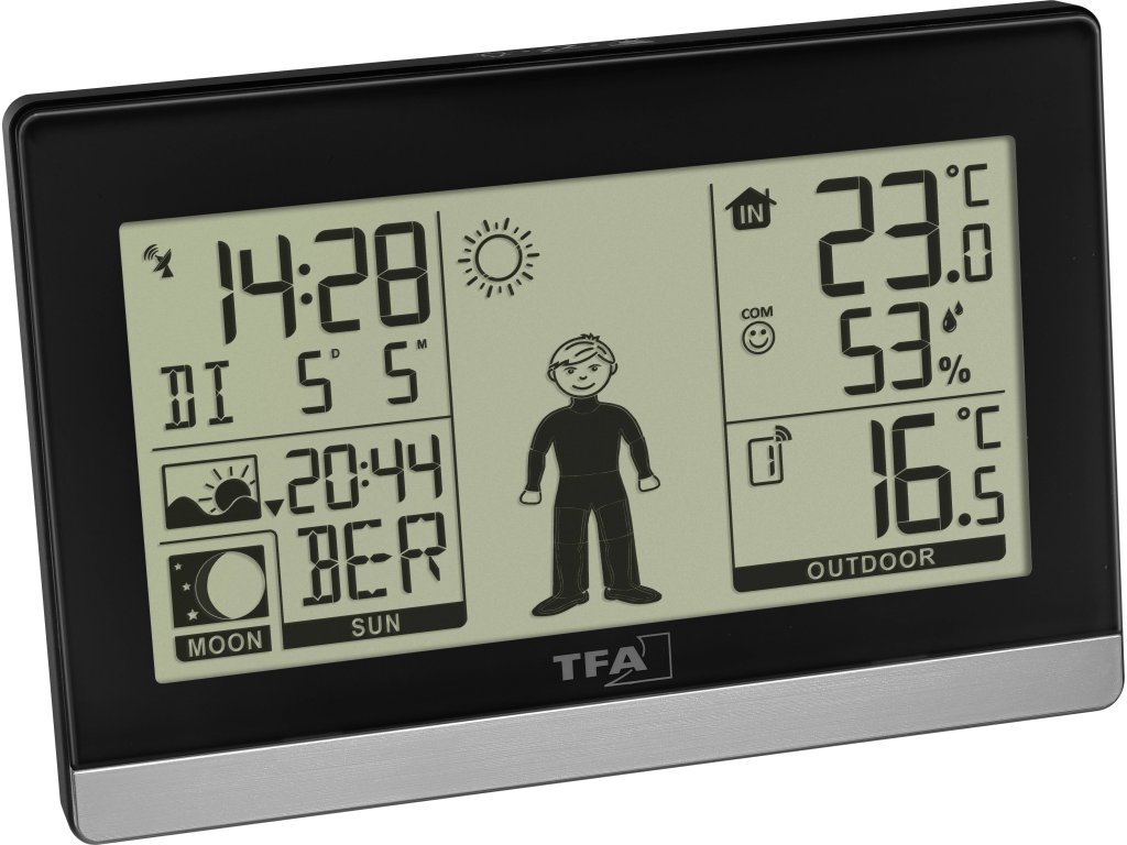 Bezdrátová meteostanice Weather Boy boduje nejen elegantním designem, ale také rozdílnou doporučováním otrub stanice Weather Moher vhodný pro aktuální venkovní teplotu, kterou jste denně přiřízli přímo na místě. Potřebná hodnota je zjištěna na místě pomocí teplotního vysílače, který je součástí dodávky (lze volitelně rozšířit na 3 vysílačů).Zda se Weather Boy může slunci nebo stoj v dešti, přístroj zjistí pomocí integrovaného elektronického barometru, který vychází z změny tlaku vzduchu a vytvoří odpovídající symbol počasí.