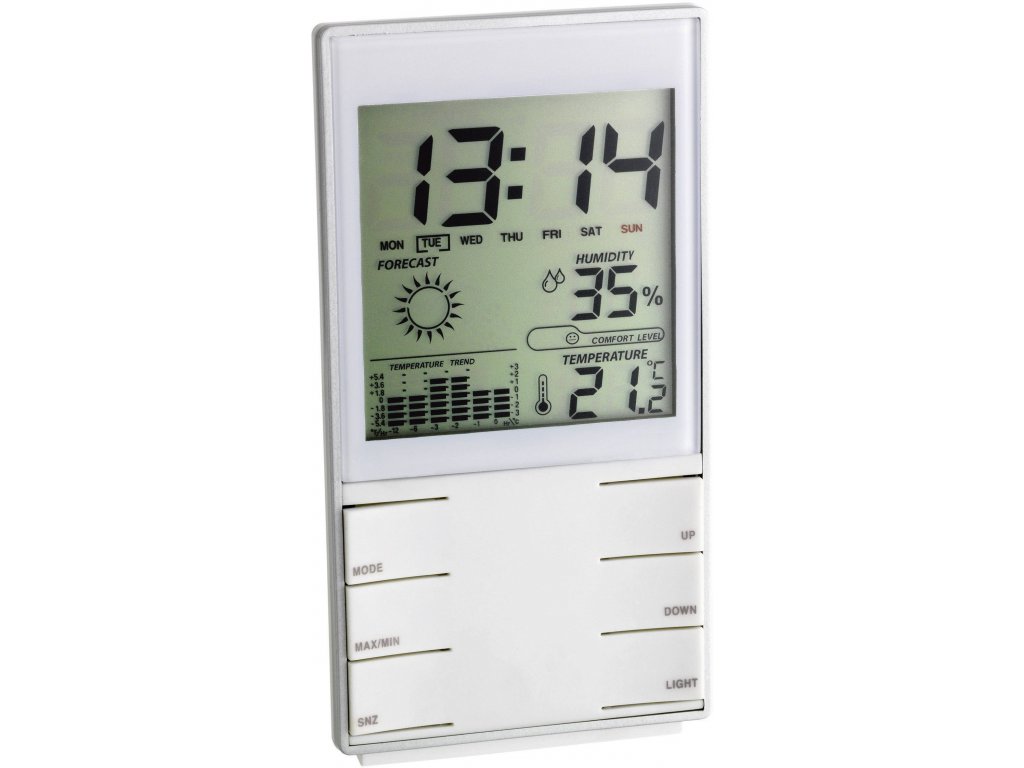 Funkce (meteostanice): | den v týdnu · předpověď počasí · průběh teploty, vlhkosti nebo tlaku vzduchu · komfortní displej · vnitřní teplota · vnitřní vlhkost vzduchu |