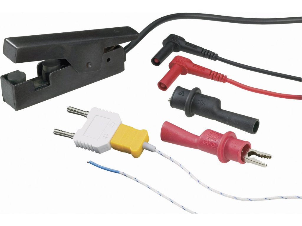 1 sada měřicích kabelů · 2x krokosvorka · Teplotní čidlo typu K (-20 až + 200 °C) · Indukční snímač počtu otáček · Gumové ochranné pouzdro · 1 baterie 9 V ·