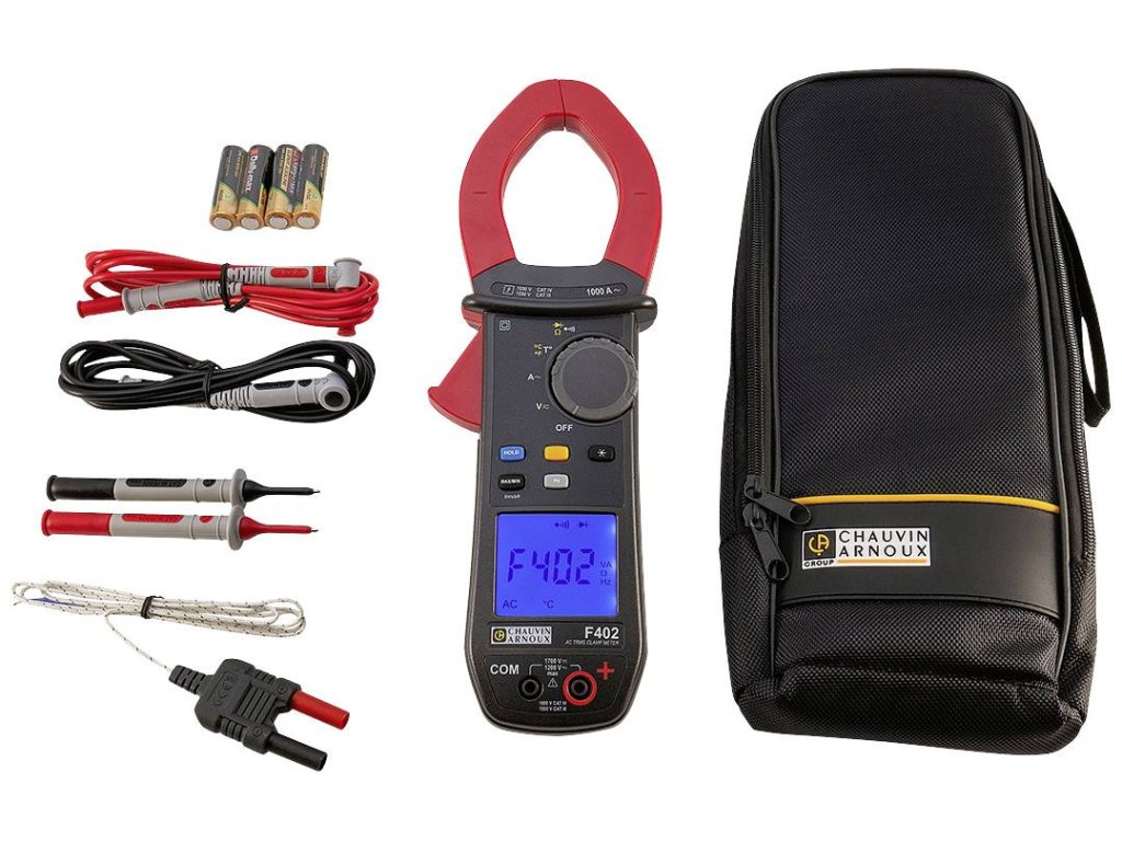 Klešťový multimetr F402·Brašna·1x sada měřicích kabelů·1 sada zkušebních hrotů·1 termočlánek typu k·4 x baterie 1,5 V.