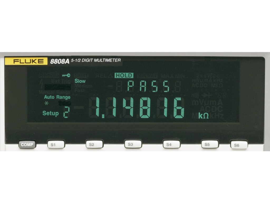 S pomocí 5,5místného multimetru Fluke 8808A lze spolehlivě provádět nejběžnější měření pro moderní aplikace. Při testu funkčnosti nebo kritických měřeních na měřicích bodech můžete zabránit výrobním chybám díky analytické funkci porovnávání limitů (s indikátory „dobře/špatně“). Především pak těm, jejichž výsledky jsou na hraně. Displej modelu 8808A je vybaven integrovanými detektory, které obsluze zřetelně ukazují, zda test proběhl úspěšně nebo ne. Indikátory „dobře/špatně“ umožňují přesné rozhodnutí. Výsledek je buď v rámci limitu, nebo mimo něj.