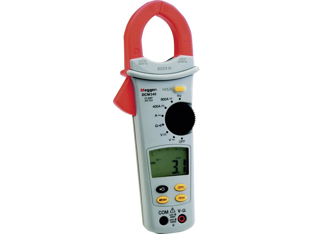 Proudové kleště DCM340 nabízejí funkci klešťového ampérmetru pro stejnosměrný i střídavý proud a zároveň funkci multimetru. Velký LCD displej s podsvícením zobrazuje navíc naměřené hodnoty v analogovém sloupcovém diagramu s vysokým rozlišením pro lepší vyhodnocení údajů. Pokud se kvůli stísněným podmínkám nedají naměřené hodnoty odečíst rovnou, slouží k jejich uložení funkce Data Hold. Funkce Min./max. ukládá maximální a minimální hodnoty, rychlá funkce Peak Hold zachycuje spínací proudy rychlostí snímání 10 ms. Funkce AutoPowerOff vypíná přístroj automaticky po 30 minutách, v případě potřeby lze tuto funkci při dlouhodobém měření deaktivovat. Funkce Relativ ukládá referenční hodnotu, přístroj poté zobrazuje odchylku naměřených hodnot od této hodnoty.Specifikace: