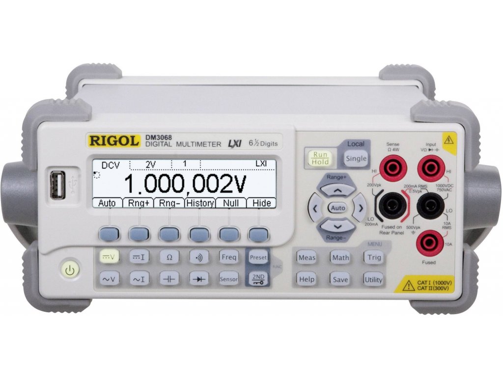 Digitální stolní multimetr DM3068 disponuje standardními měřicími funkcemi: napět (AC/DC), proud (AC/DC), odpor, test diod, kapacita a měření frekvence. Pomocí velkého 6,5místného displeje se všechny parametry přehledně zobrazí. Přístroj lze ovládat přes USB, LAN (LXI-C), RS 232 a GPIB. Špičkový model navíc doplňuje možnost přímého měření teploty, velká interní paměť a vysokorychlostní záznam naměřených hodnot - až 10 000 měření za sekundu.Specifikace: