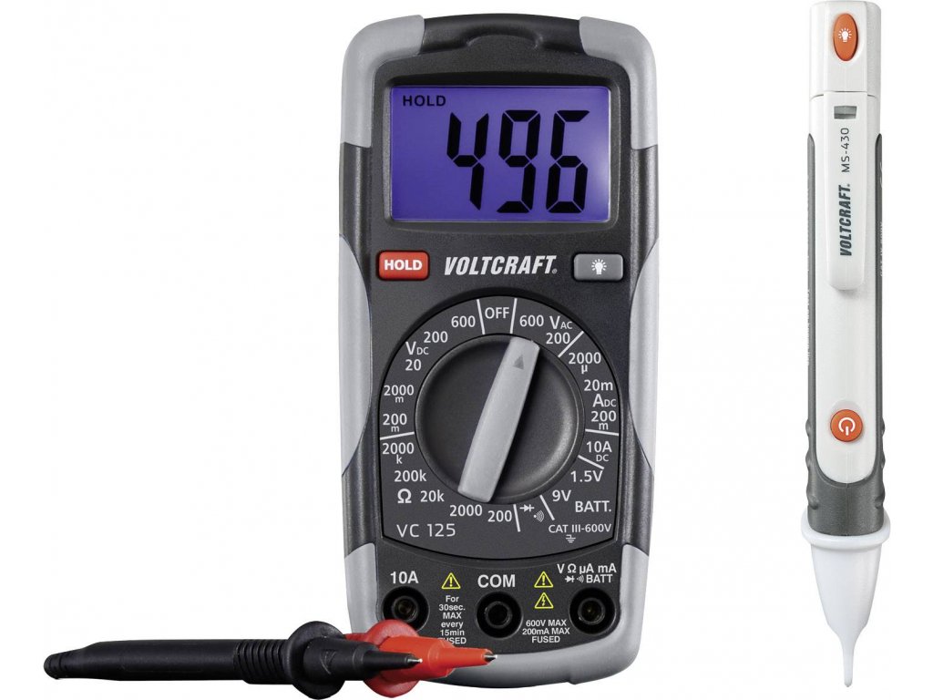 Digitální multimetr a bezdotyková zkoušečka napětí umožňují rychlé vyhledávání poruch v elektrických zařízeních. Multimetr je díky svým standardním měřicím rozsahům vhodný i pro použití v automobilech.Specifikace: