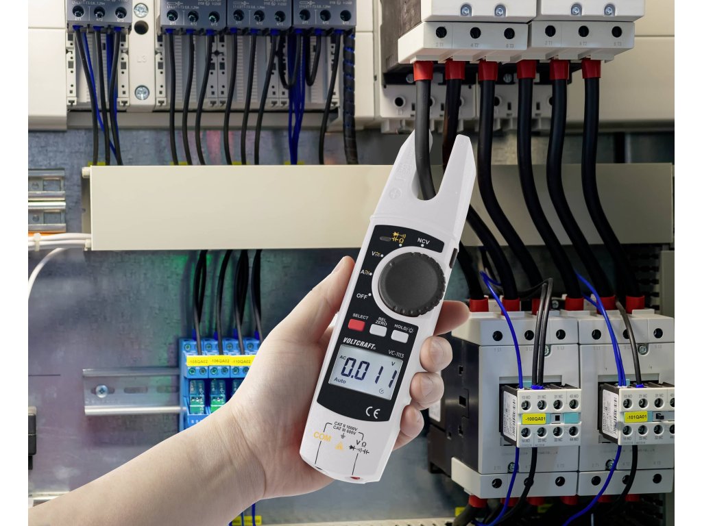Přesné naměřené hodnoty, snadná manipulaceDíky praktickému měřicímu kabelu lze proudové kleště VOLTCRAFT VC-1113 použít při rozevření na 14,7 mm k bezdotykovým měřením proudu do 200 A. Pro měření proudu není nutné nejprve otevřít kleště, abyste vodiče nasadili do měřicí polohy. U vidlicového provedení stačí vložit vodiče. Součástí dodávky jsou také měřicí kabely pro měření napětí, odporu a kapacity, pro zkoušku průchodnosti a pro test diod. Měření skutečné efektivní hodnoty True RMS dovoluje přesné měření nesymetrických napětí a proudůVšechny hodnoty viditelné na první pohledLCD displej má rozlišení až 6000 hodnot a díky podsvícení je dobře čitelný i za špatných světelných podmínek. Vestavěná kapesní svítilna vám v případě potřeby poskytne dodatečné světlo pro pracovní plochu. A pokud se displej při měření dostane mimo zorné pole uživatele, lze naměřenou hodnotu zmrazit pomocí funkce Hold a následně pohodlně odečíst.Další praktické funkceVOLTCRAFT VC-1113 disponuje testem průchodnosti s bzučákem, na špičce proudových kleští se nachází také senzor NCV (bezkontaktní detekce napětí) pro bezdotykovou detekci střídavého napětí ve vodičích. Šetří baterii: Multimetr se po cca 15 minutách vypne, když se nepoužívá, a ukazatel stavu baterie chrání před nečekaným výpadkem. VOLTCRAFT VC-1113 se dodává v praktické transportní brašně a se dvěma AA bateriemi.Specifikace: