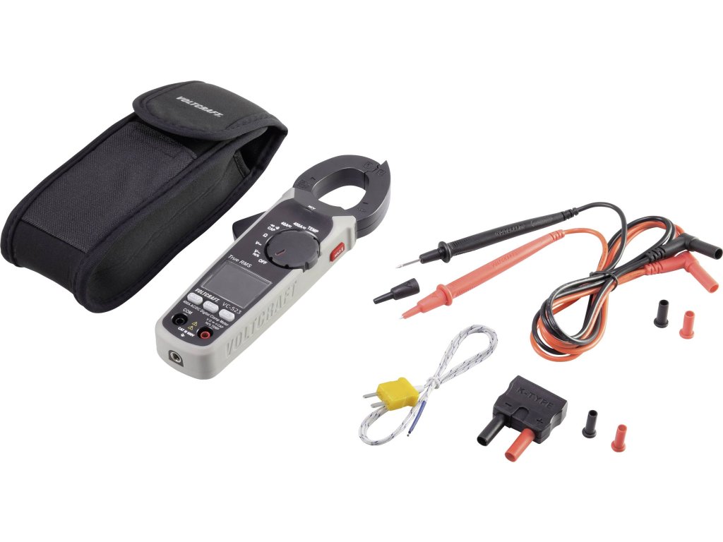 Proudové kleště VC-523·Bezpečnostní měřicí kabely·Termočlánek typu K, vzduchové čidlo (-20 až +230°C)·Měřicí adaptér typu K·Pouzdro·3x baterie AAA (1,5 V)·