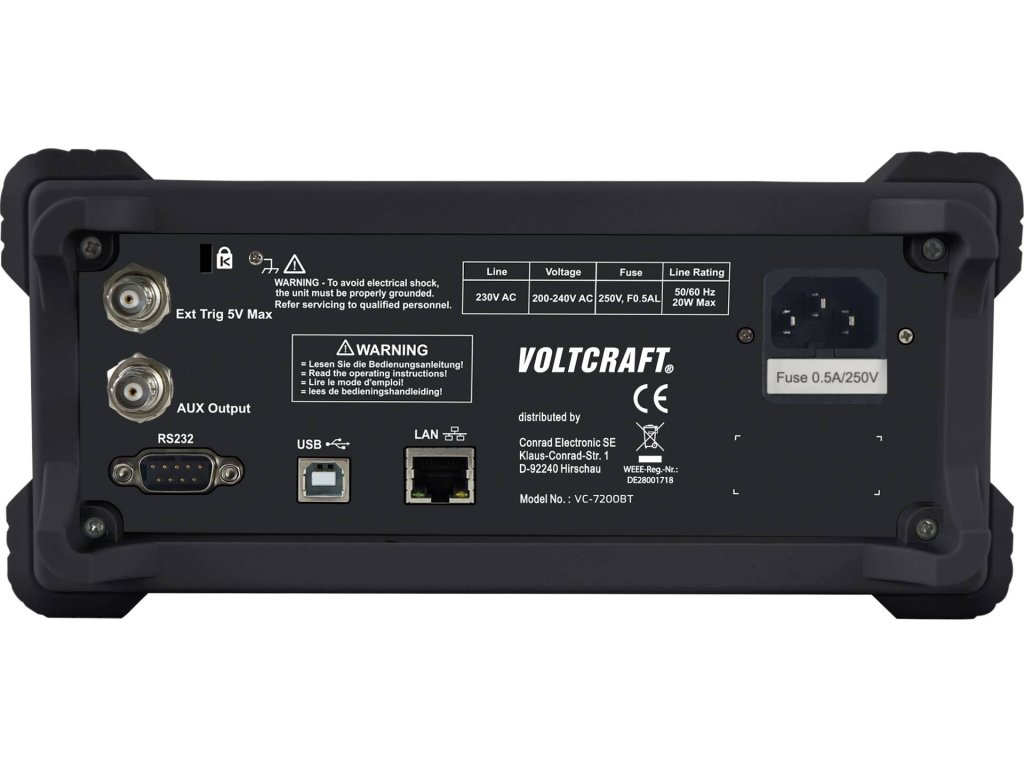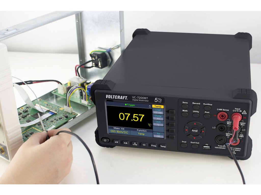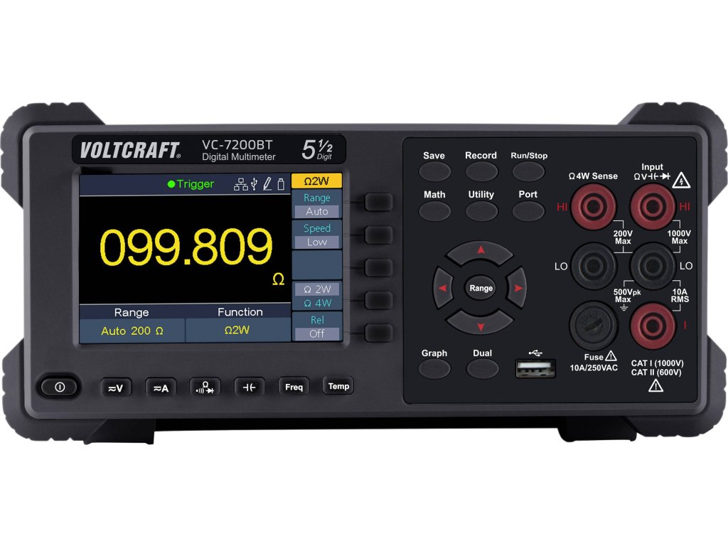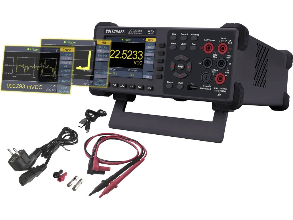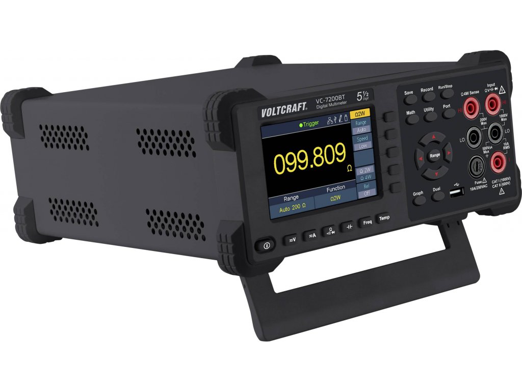 Voltcratf VC-7200BT je digitální dvojitý multimetr ve stolním formátu s 5 1/2 místy, který nabízí širokou paletu funkcí pro výsledky měření (statistika, mezní hodnoty, dB/dBm, REL).VC-7200BT má 10,16 cm displej (4"). Zaznamenává až 150 naměřených hodnot za sekundu.Přístroj je ideální pro všechny, kdo požadují vysoký výkon, mnoho funkcí a automatická měření.Přesné měření efektivní hodnotySkutečná funkce měření efektivní hodnoty umožňuje přesné měření asymetrických napětí a proudů, které se liší od základní sinusové křivky.Asymetrická napětí vznikají většinou u regulátorů výkonu, taktovaných spínacích regulátorů, impulzních nabíječek nebo u elektronických regulátorů otáček v modelářství.Tovární kalibraceKalibrace dle norem výrobce a kontroly kvality VOLTCRAFT.Kalibrace zajišťuje vysokou kvalitu výrobku a odpovídající tolerance.Specifikace: