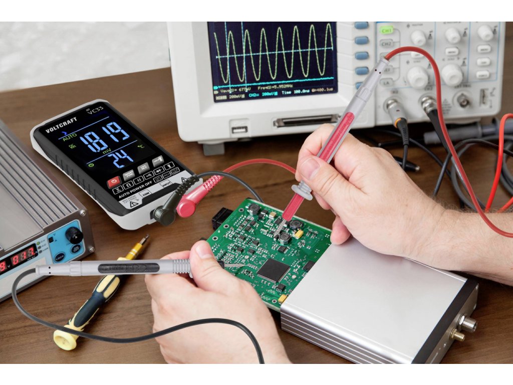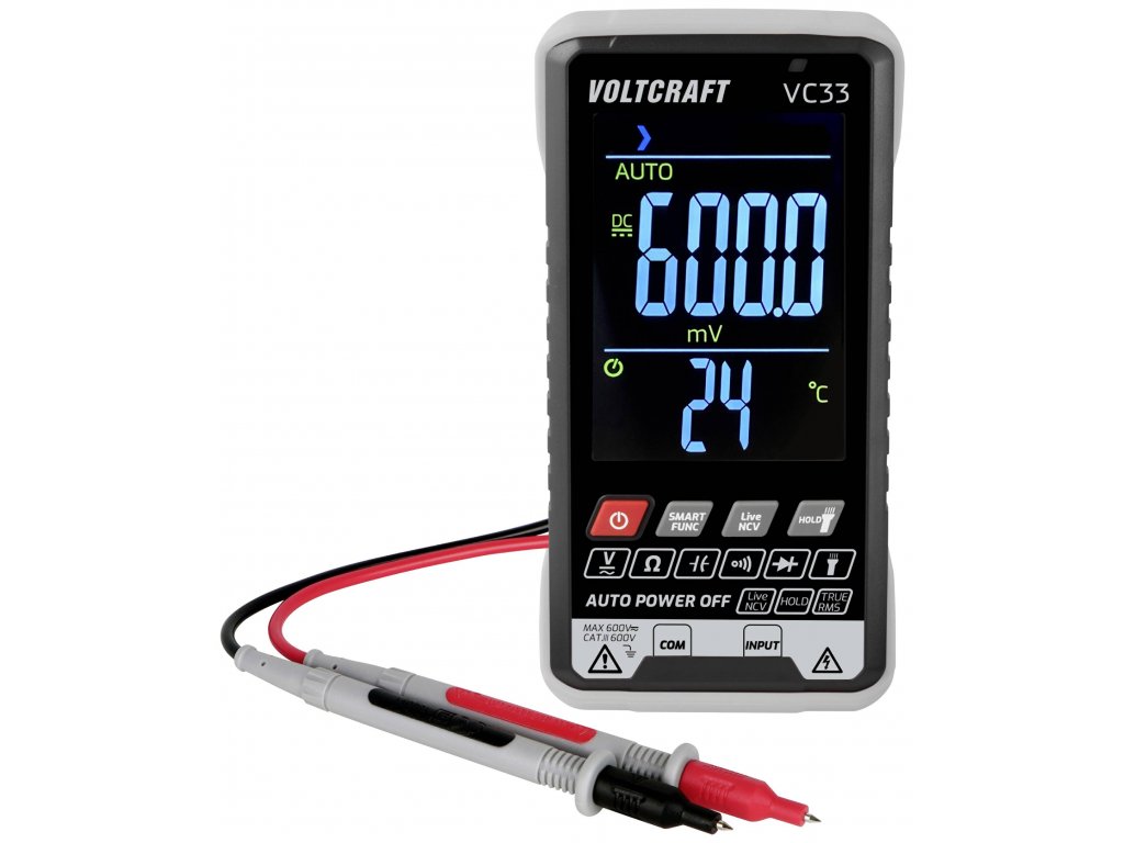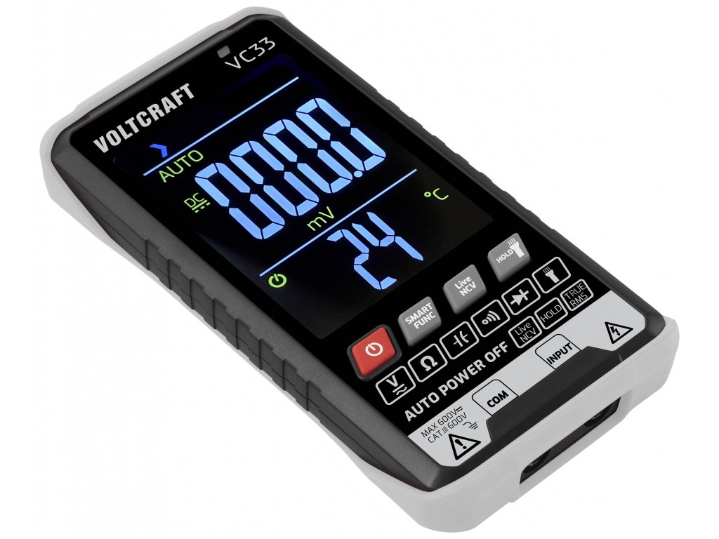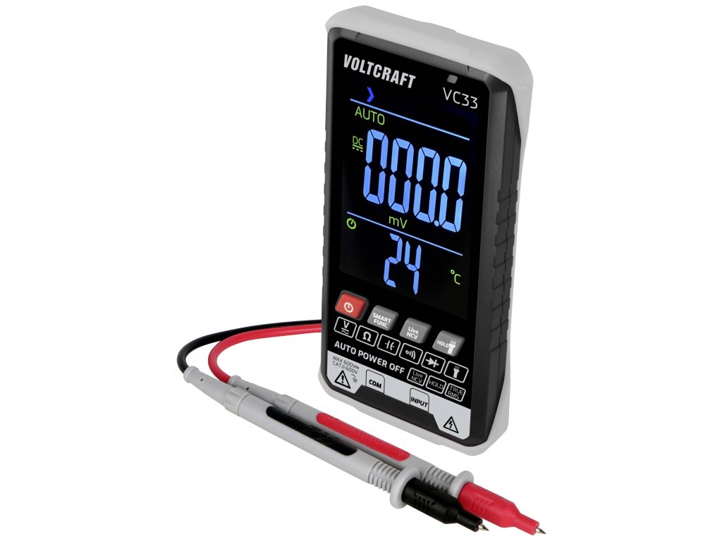 Multimetr Voltcraft SmartDMM VC33 je použitelný v rozsahu měření CAT III 600V a nabízí řadu funkcí, od měření AC/DC napětí přes měření odporu a kapacity až po test diod. Mimoto je možné bezdotykové rozpoznání napětí (NCV).