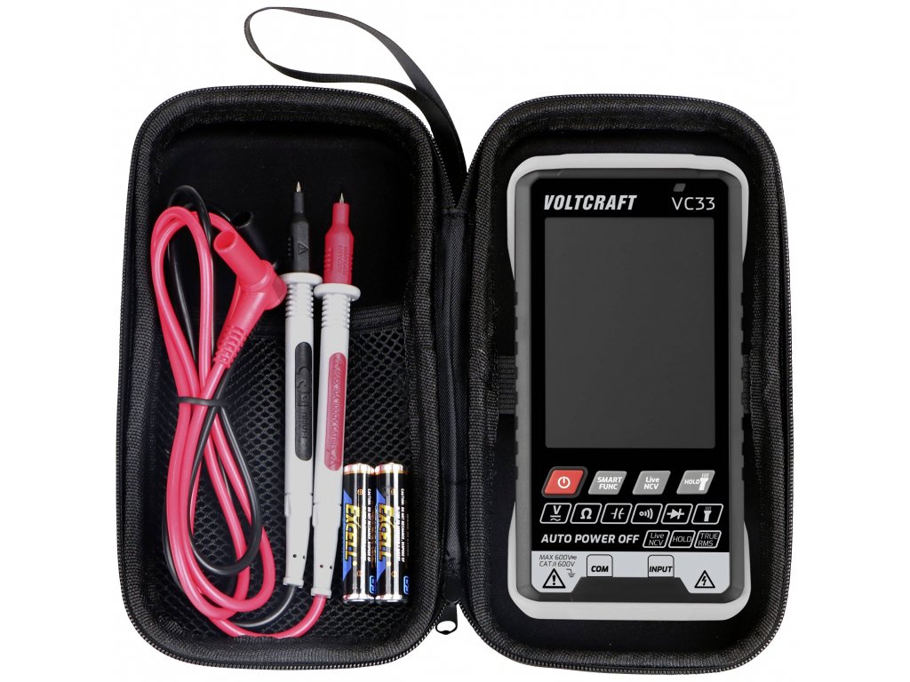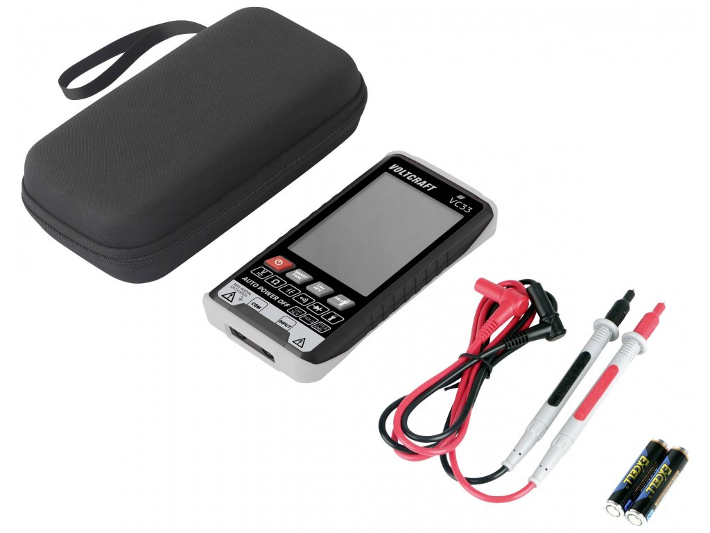Multimetr Voltcraft SmartDMM VC33 se dodává s bateriemi, 1 párem měřicích kabelů, uživatelskou příručkou a praktickou přepravní brašnou.