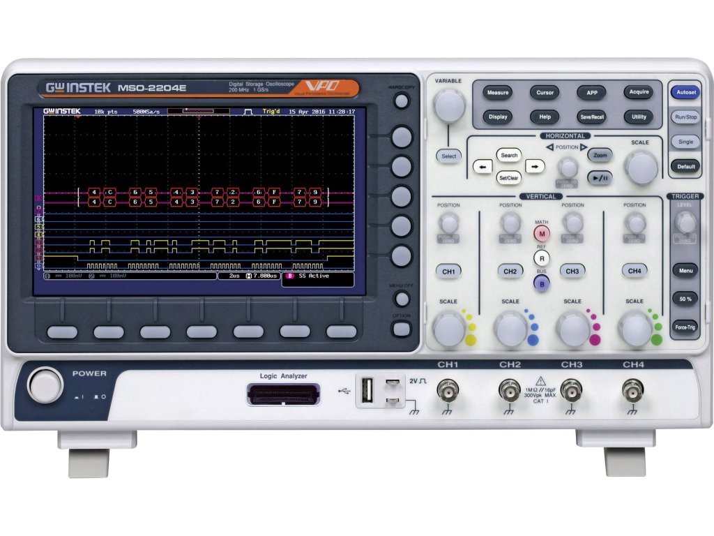 GW Instek MSO-2204E digitální osciloskop 200 MHz, 20kanálový, 1 GSa/s, 10 Mpts, 8 Bit, s pamětí (DSO), mixovaný signál (MSO), logický analyzátor, 1 ks,