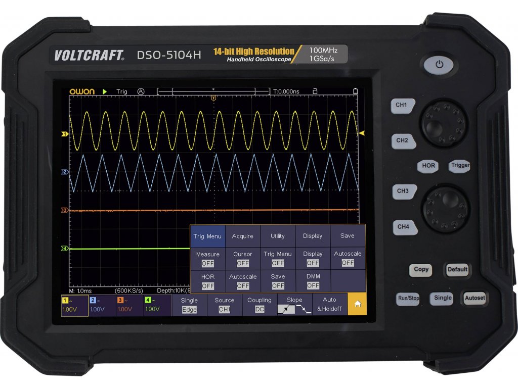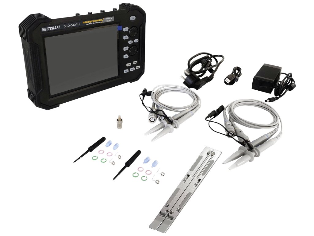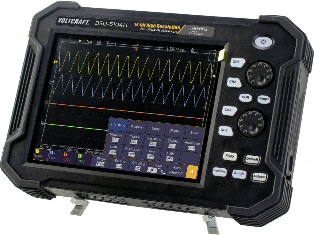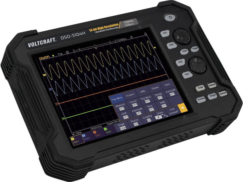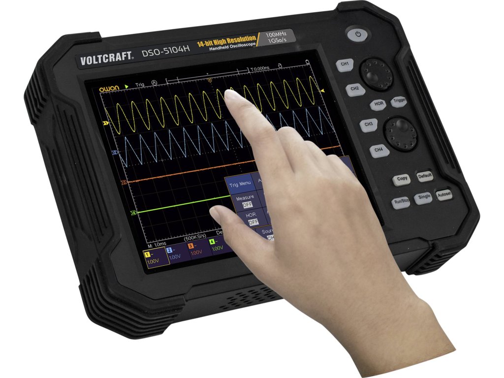 VOLTCRAFT DSO-5104H Ruční osciloskop 100 MHz, 4kanálový, 1 GSa/s, 40 Mpts, 14 Bit, s pamětí (DSO), ruční provedení, 1 ks, VC-11332625