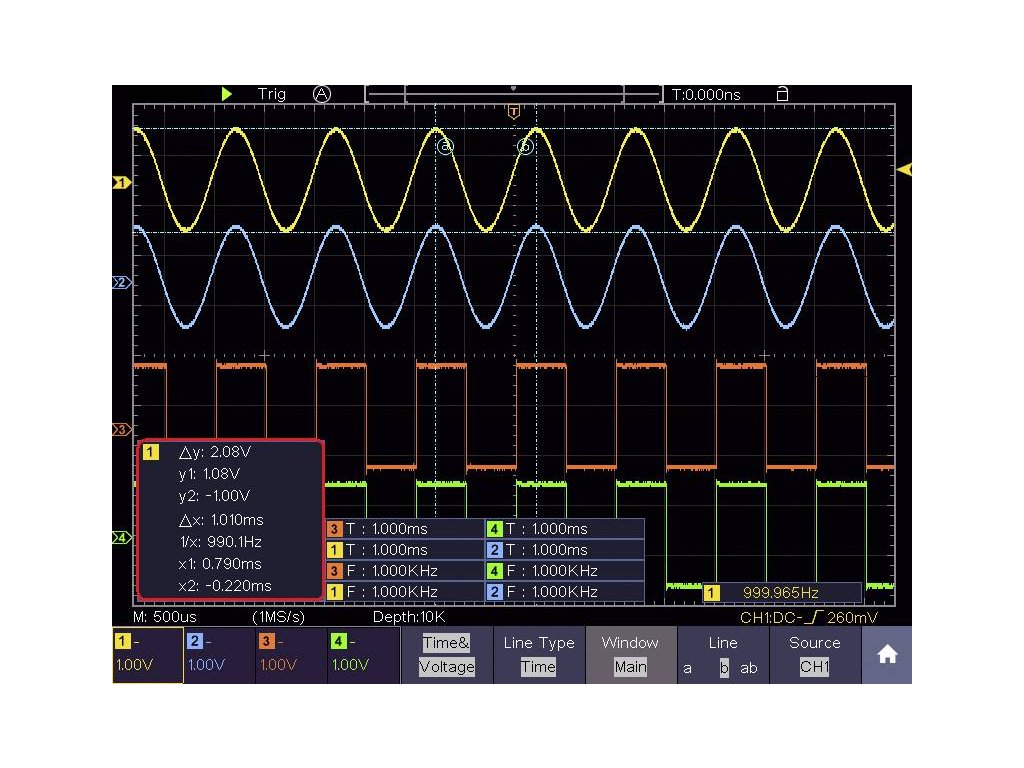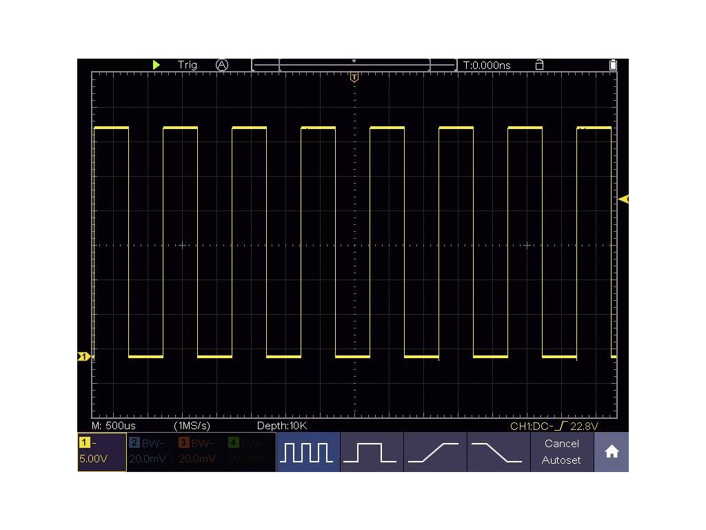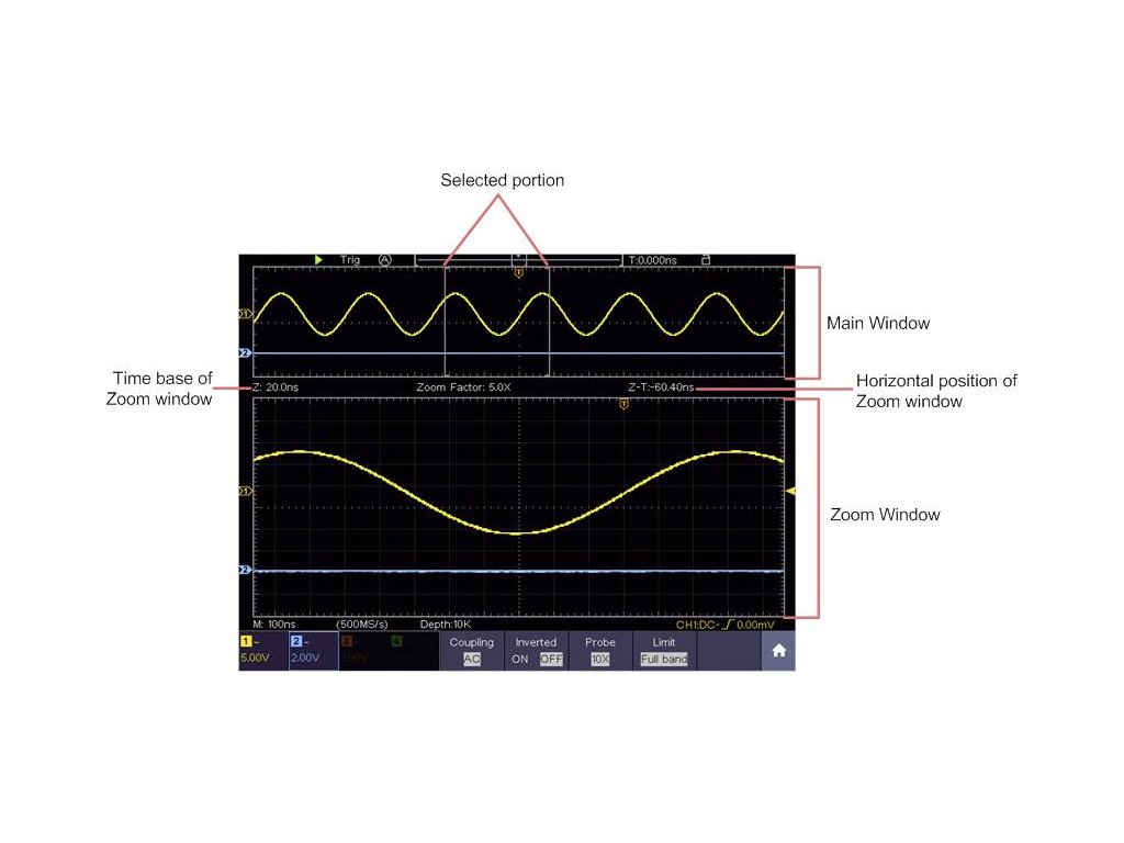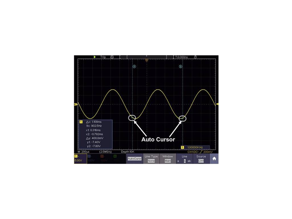 Šířka pásma: 100MHzMaximální vzorkovací frekvence 1 GS/s.Vertikální rozlišení: Max. 14 bitůDélka záznamu: 40 minutRychlost aktualizace křivky: 45.000 wfms/s.Horizontální stupnice: 2ns/díl - 1000 s/díl, v krocích po 1-2-5Doba náběhu