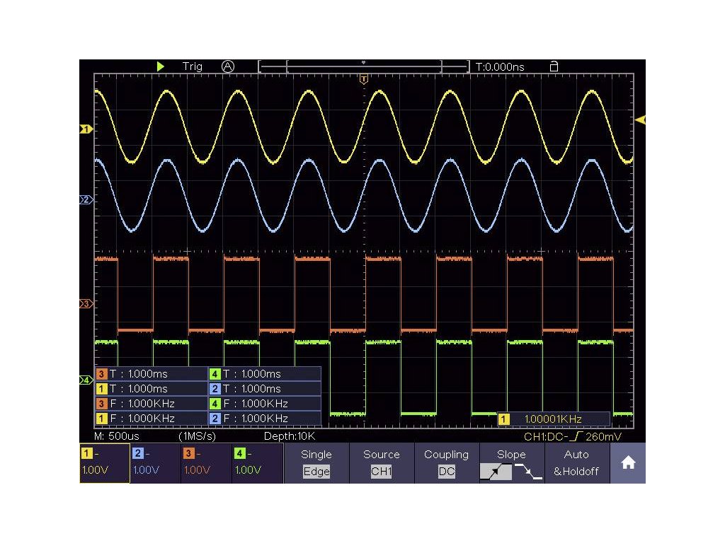 Generátor funkcí s frekvencí 25 MHz lze ovládat přes dotykový panel nebo klasicky pomocí tlačítek. Lze vyvolat čtyři průběhy signálu: sinus, obdélník, rampa a puls. Předdefinováno je dalších 46 arbitrárních průběhů signálu – patří mezi ně např. exponenciální, schodišťový, funkce sinus a šum. Lze uložit i vlastní arbitrární průběhy.