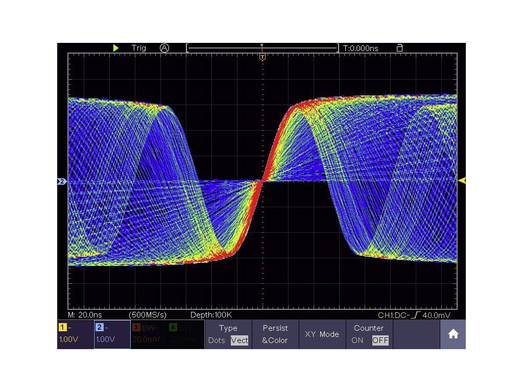 Při měnících se frekvencích jsou opakující se průběhy signálu zobrazovány v barvách duhy podle jejich četnosti.