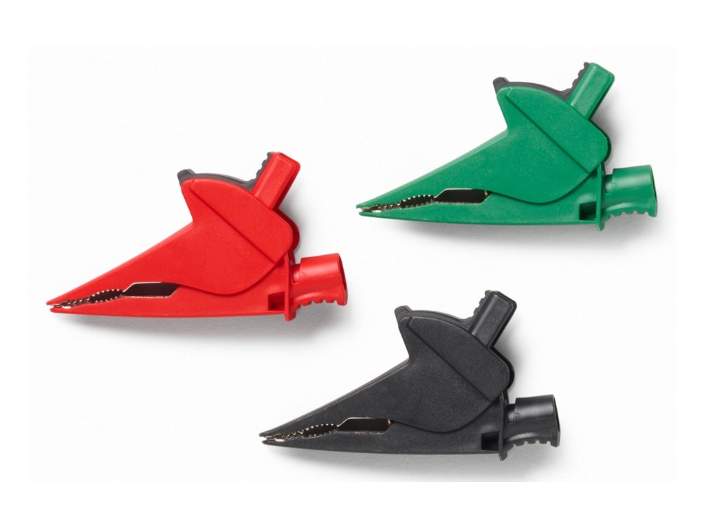 Sada krokosvorek Fluke AC385-RGB SureGrip™ je navržena tak, aby poskytovala pevné a bezpečné připojení v solárním a vysokonapěťovém testovacím prostředí. Tyto krokosvorky splňují bezpečnostní kategorie CAT III 1 500 V a CAT IV 1 000 V, 30A.