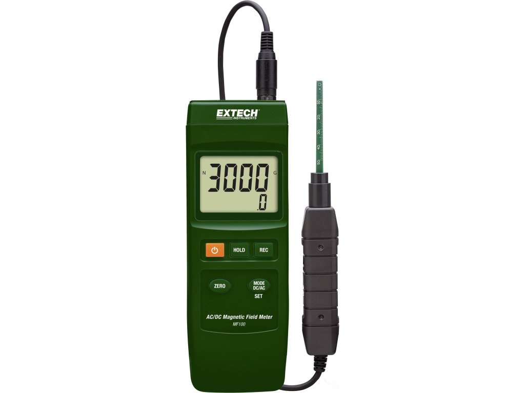 Zkoušečka magnetického pole MF100 AC/DC disponuje automatickou kompenzací teploty pomocí snímače využívajícího tzv. Hallova jevu. Její výbava zahrnuje zobrazení severního a jižního magnetického pólu, tlačítko nulového bodu pro měření stejnosměrného proudu, funkci Data Hold, záznam minimálních a maximálních hodnot a automatické vypnutí s možností deaktivace.Obsah balení:
